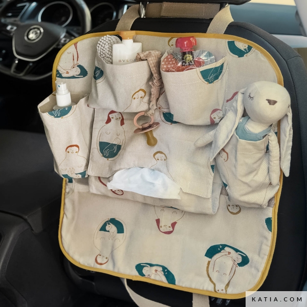 Benutzen Sie diese Nähschablone für eine praktische Aufbewahrungstasche aus Canvas für das Auto. Mit Taschen und Fächern, um alles das unterzubringen, was Sie auf einer Autofahrt benötigen. Eine Tasche, mit der Sie die Feuchttücher, das Fläschchen und die Spiele für Ihr Kind griffbereit haben.