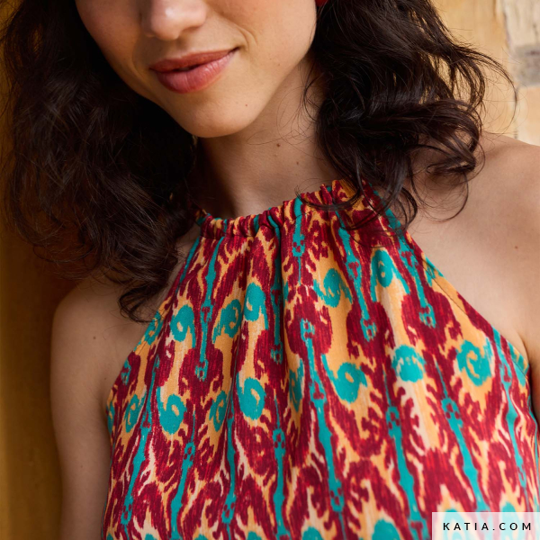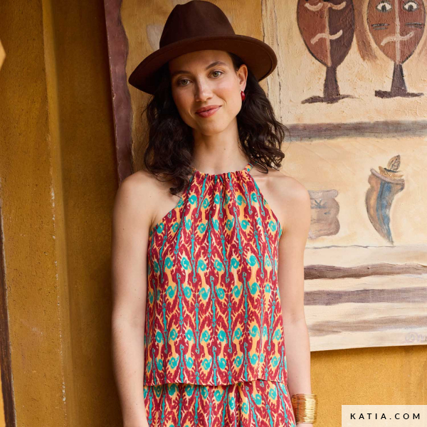 Entdecke das Schnittmuster für ein Damen-Top von Katia Fabrics – ein leichtes und frisches Kleidungsstück mit schmalen Trägern und verstellbarem, gerafftem Ausschnitt mit Schleife. Sein schlichtes und vielseitiges Design macht es zum perfekten Begleiter für den Sommer, kombinierbar mit Shorts, Röcken oder Hosen. Du kannst es aus weichen, luftigen Stoffen wie Baumwolle oder Viskose von Katia Fabrics nähen und so ein bequemes und feminines Top erhalten.