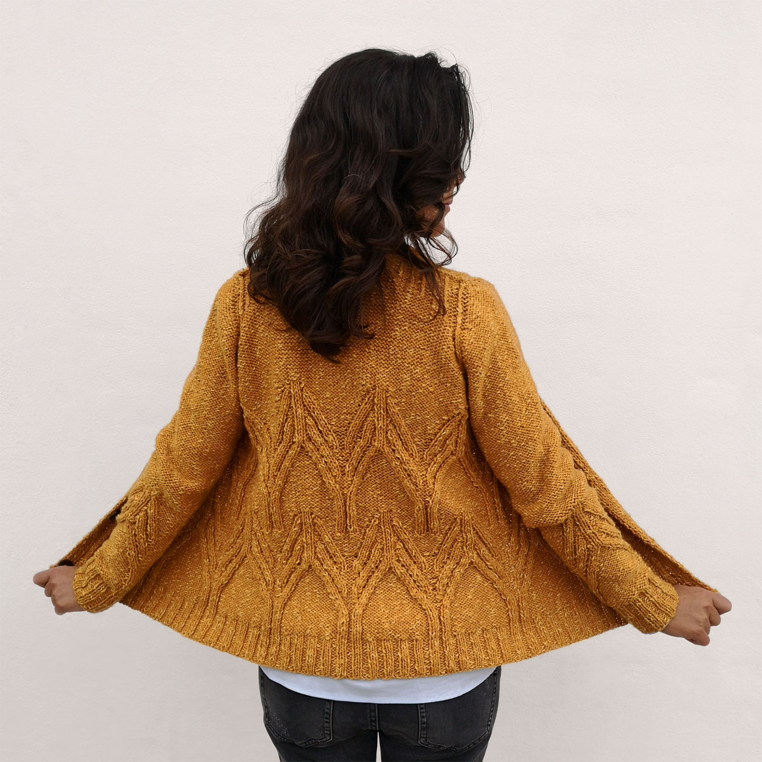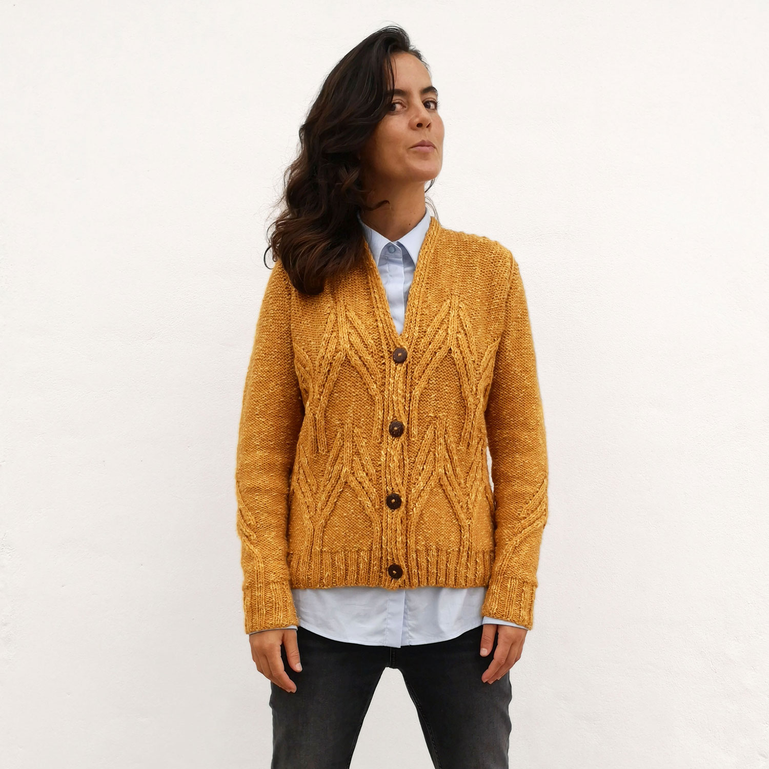 Für HOMELIKE habe ich mich von den alten Häusern inspirieren lassen, die damals speziell für den Menschen und seine Bedürfnisse gebaut wurden. Sie waren warm im Winter, kühl im Sommer, mit hohen Decken, die die Fantasie beflügeln, und dicken Balken, die dir Halt geben. In ihren Räumen wurden Tisch, Feuer und Zeit geteilt. Durch die kleinen Fenster sickerte das Sonnenlicht in die Ecken und der Mond malte tanzende Schatten. In meinem Schaffen arbeite ich zuerst das Konzept aus, das mich durch den gesamten Prozess führt. In diesem Fall: Das Gefühl von Heimat im Gestrickten. In meinem Kopf hatte ich das Bild meines Dachs, mit Schindeln voller Flechten. Daraufhin habe ich ein Garn gesucht, dass eine angenehme Textur hat, leicht ist, aber dennoch mit Volumen und Melange-Effekt. Ich habe mich für Merino Flamé in Ocker entschieden, weil es mich an die Flechten und die Wärme der Glut im Kamin erinnert. Nun bleibt nur noch, das Stricken zu genießen.