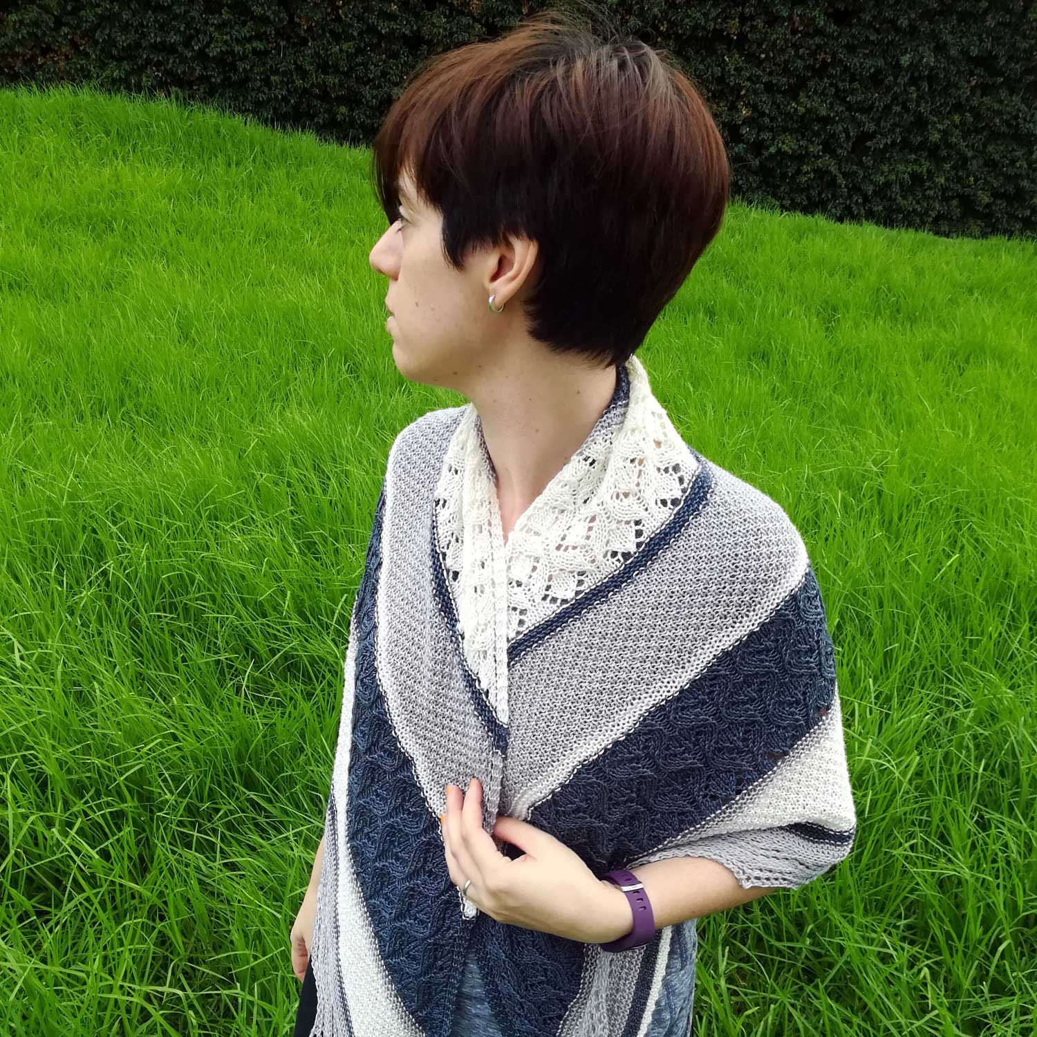 Das Tuch Luna de Otoño (Herbstmond) ist von der herbstlichen Natur inspiriert, von den Farben der Nacht und dem Widerschein des Mondes auf der nächtlichen Landschaft. Das neue Garn Tencel-Merino der Reihe Concept by Katia hat genau den richtigen Glanz und die Weichheit für einen solches Tuch. Es fällt toll und hat eine so schöne Oberfläche, dass du das Tuch den ganzen Herbst über nicht ablegen wirst. Das Dreieckstuch wird auf einer langen Rundstricknadel gearbeitet, damit alle Maschen bequem darauf Platz finden. Es gibt einfache Teile in kraus rechts und doppeltem Perlmuster, und im Kontrast dazu Streifen mit Lace-Muster, die jedoch einfach zu stricken sind. Das Design erlaubt eine schier endliche Variation von Farben.