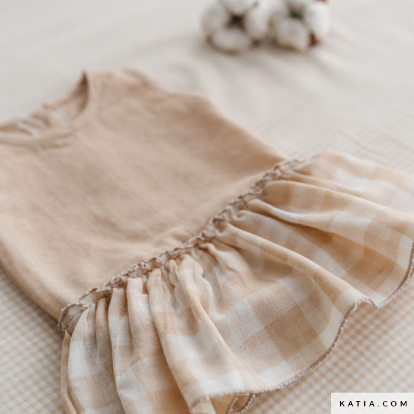 Nähe dieses hübsche Babykleid mit angenähter Hose, ideal sowohl für besondere Anlässe als auch für den Alltag. Das ärmellose Kleid verfügt über einen runden Ausschnitt, einen gerafften Rock und einen Knopfverschluss auf der Rückseite, um das Anziehen zu erleichtern. Das angenähte Höschen sorgt für zusätzlichen Komfort und eine perfekte Passform. Ein praktisches Nähprojekt voller Zärtlichkeit, empfohlen für weiche Stoffe wie Baumwolle, Popeline oder leichte Druckstoffe von Katia Fabrics.