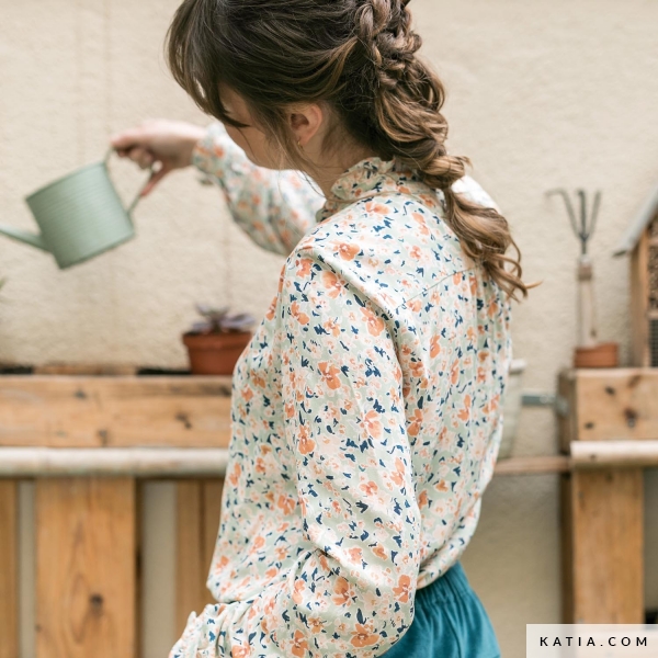 Wenn Sie dieses Blusenmodell mit Knopfleiste und am Halsausschnitt gekräuseltem Besatz mit einem der Ecoviscose-Stoffe von Katia Fabrics nähen, wird es bestimmt eins Ihrer Lieblingskleidungsstücke werden, denn der Ecoviscose-Stoff ist hübsch bedruckt und fühlt sich sehr angenehm an.