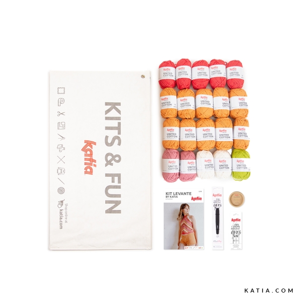 Zeig dich diesen Sommer in jugendlichen und modernen Outfits wie dem Set Levante by Katia! Häkle ein Neckholder-Top, das im Nacken gebunden wird, und zwar in einer Kombination kräftiger Farben unseres Garns United Cotton und verschiedenen Maschenarten in Pfeilform. Mach deinen Look komplett mit einem Paar gehäkelter Shorts aus Stäbchen mit Bündchen im Rippenmuster. Genieße den Sommer mit diesem frischen Zweiteiler!