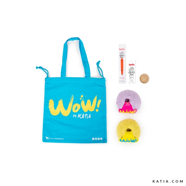 Das Kit enthält die notwendigen Knäuel Summer Vibes von WOW! by Katia in deiner Lieblingsfarbkombi und eine praktische Totebag aus 100 % Baumwolle.