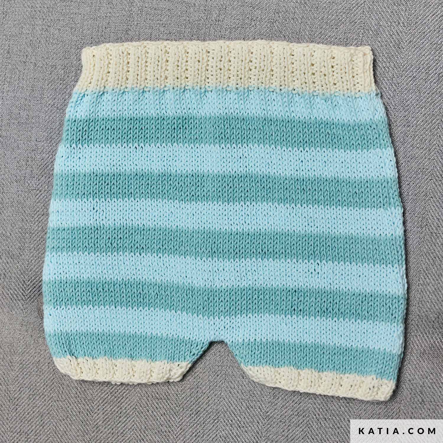 Diese Strickanleitung für eine Shorts wird mit Katia Panama gestrickt. Dieses Modell vereint Streifen für Sommerfeeling, kontrastfarbene Elastikabschlüsse für Komfort und guten Sitz. Verfügbar in der Zeitschrift Katia Baby 116 und als PDF auf katia.com. Spiel mit den Farben von Katia Panama und stricke ein leichtes, fröhliches Sommerteil.