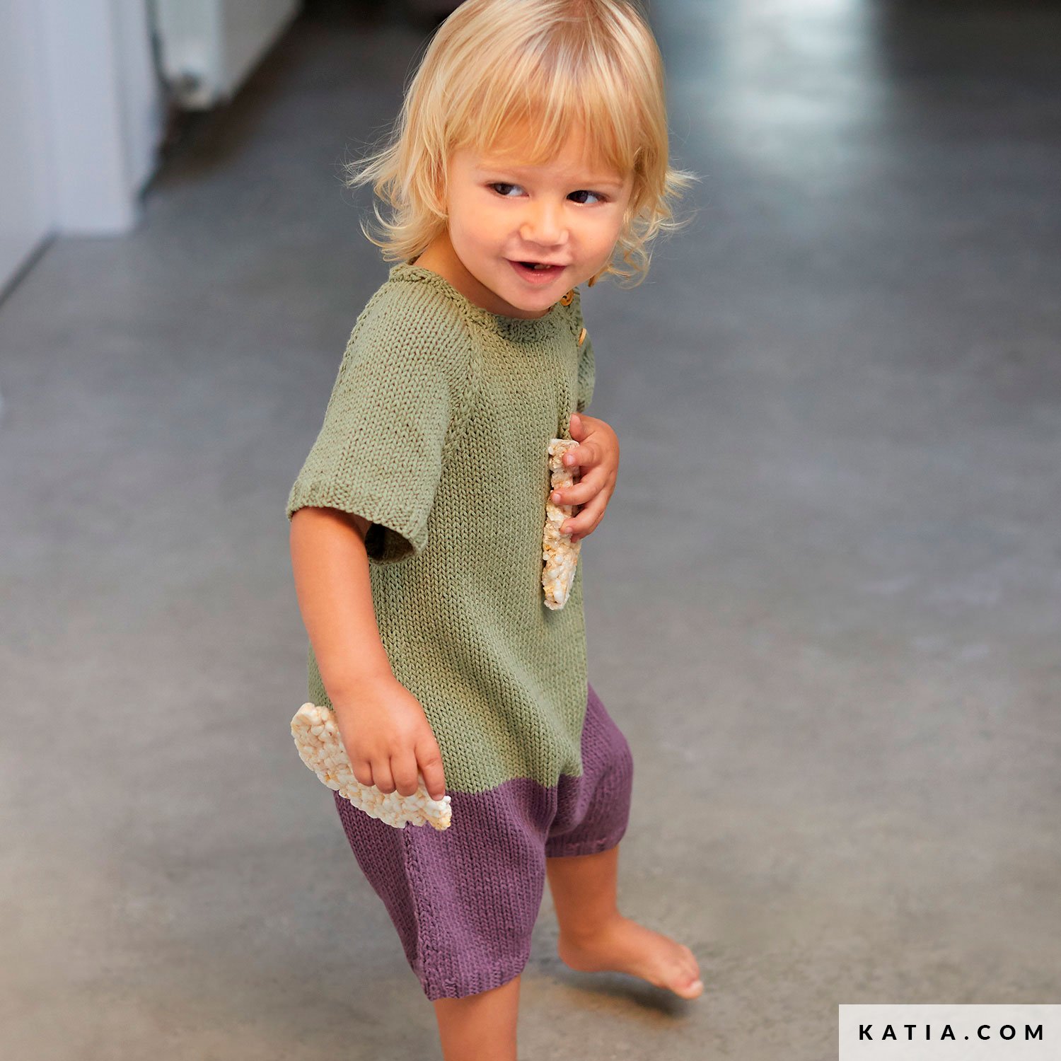 Wenn du nach bequemen und modernen Modellen für dein Baby suchst, dann setze diese Strickanleitung auf deine Favoritenliste. Diesen Strampler mit kurzen Ärmeln strickst du aus zwei der neuen Farben von Katia Missouri. Er ist locker geschnitten und wird mit Knöpfen auf der Raglanlinie geschlossen.