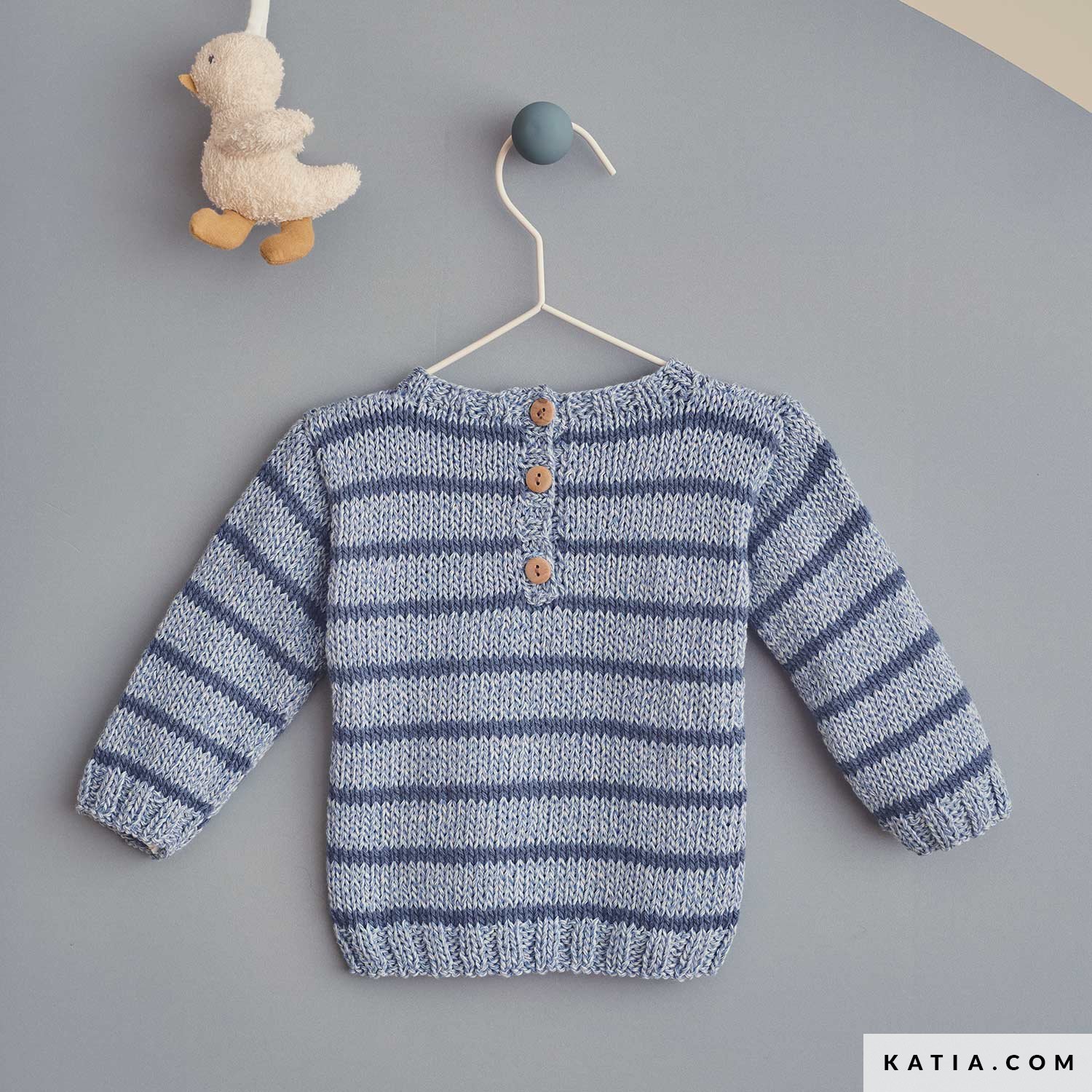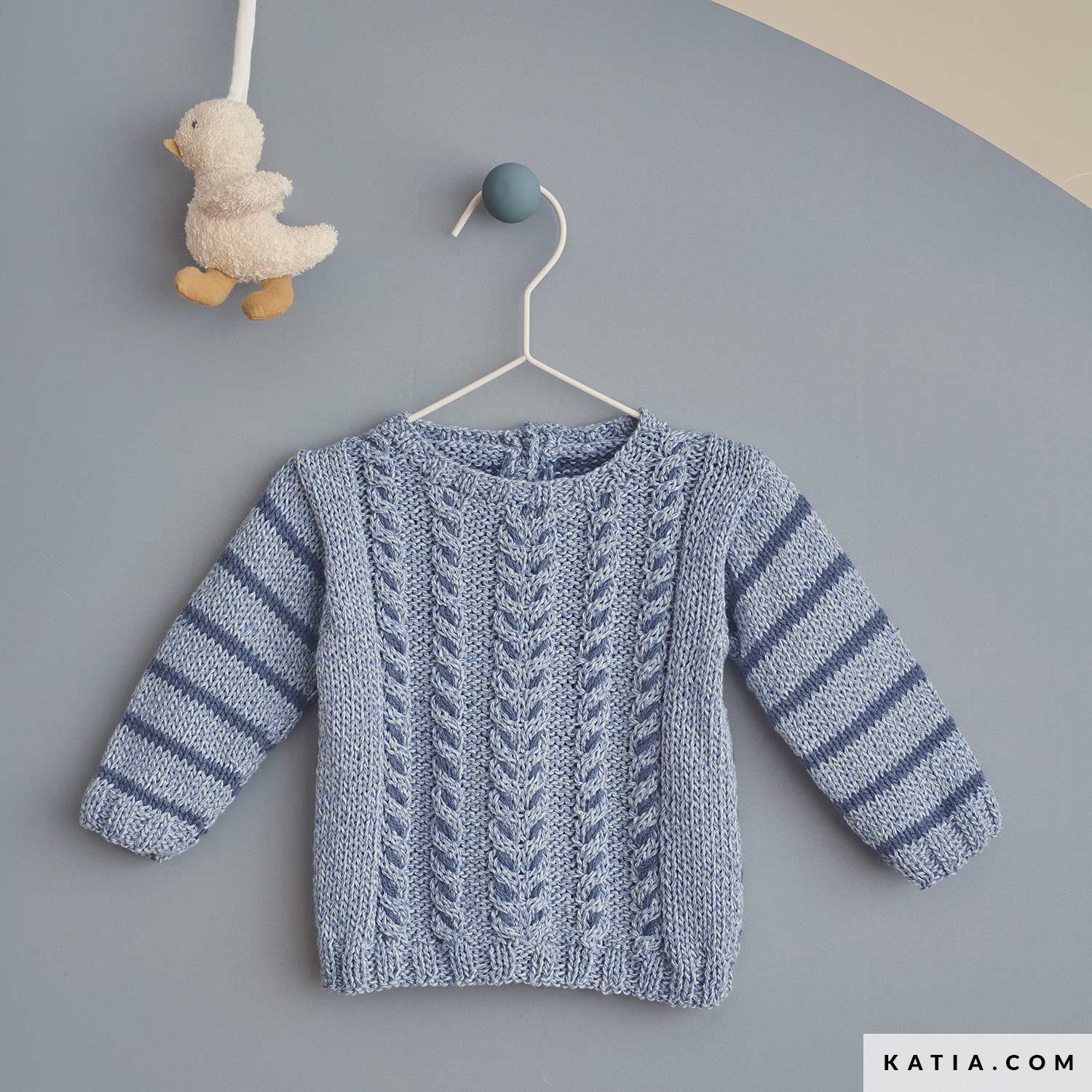 Hier ist die süßeste Anleitung für einen Baby-Pullover. Stricke dieses zweifarbige Design mit Streifen an den Ärmeln und am Rücken und fordere dich selbst mit den Zöpfen auf der Vorderseite heraus. Hergestellt aus Katia Aqua und Cotton-Yak von Concept by Katia, ist diese Anleitung perfekt für erfahrene Strickerinnen, die nach neuen Herausforderungen suchen. Außerdem hat sie 3 kleine Knöpfe auf der Rückseite, um das Baby leicht anzuziehen. Stricken war noch nie so viel Spaß!