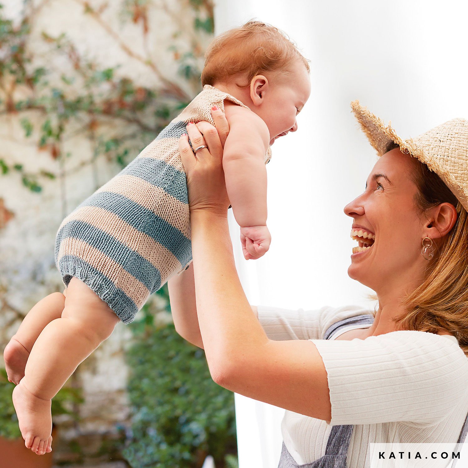 Stricke in diesem Sommer diesen niedlichen ärmellosen Strampler. Folge einfach Schritt für Schritt der Anleitung aus unserem Magazin Katia Baby 96 und stricke das gestreifte Design aus deiner Lieblingsfarbkombi unserer Bio-Baumwolle Fair Cotton.
