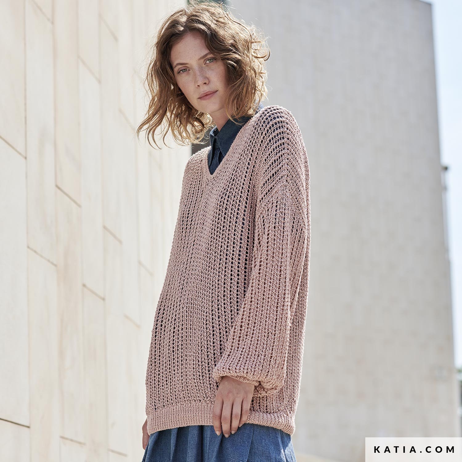 Einfacher Strickpulli aus Versailles, einem Viskosegarn mit kleinen silbernen Details. Die metallischen Effekte in dem Garn verleihen einem Casual-Look einen glamourösen Touch. In dieser Anleitung vereinen wir ein einfaches Lochmuster, einen verteilhaften V-Ausschnitt und gerade lange Ballonärmel.