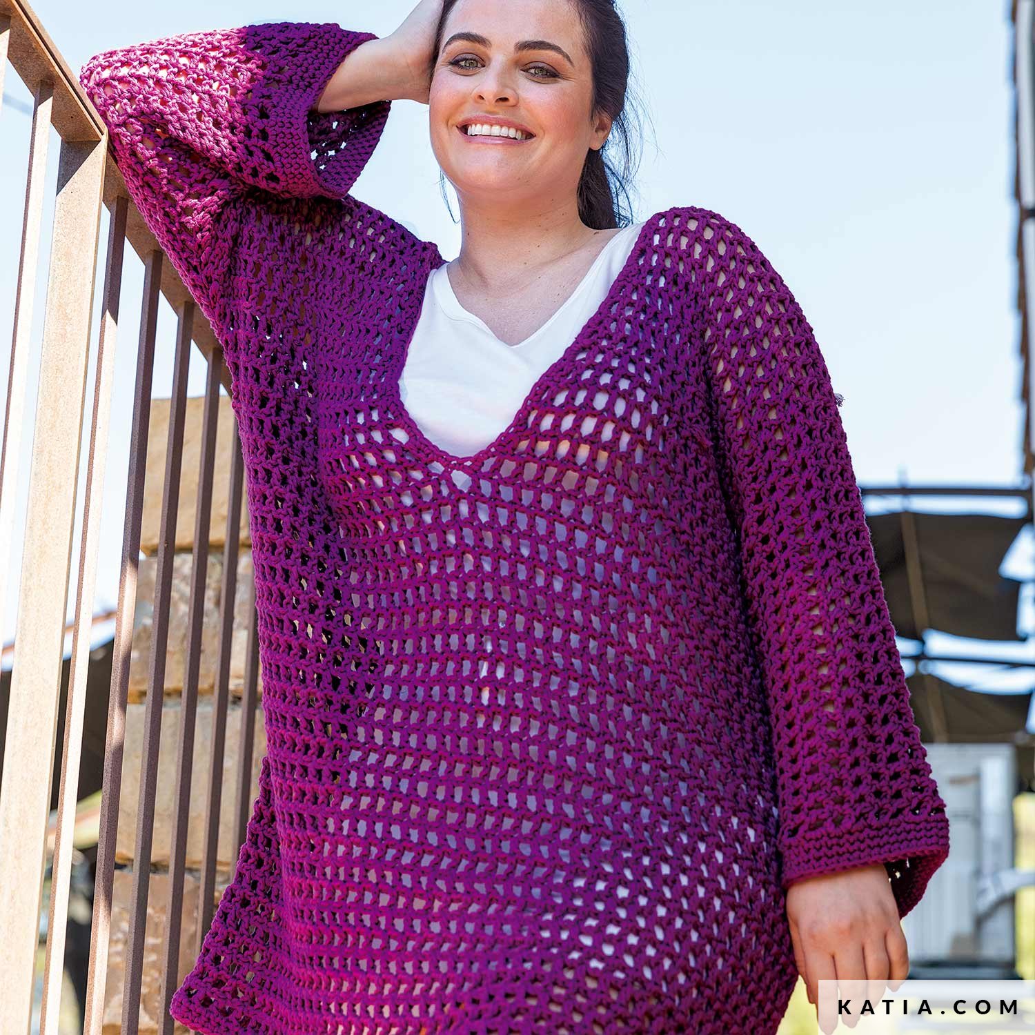 Suchst du ein Modell, das Glamour, Stil und Komfort verbindet? Dann ist diese Häkelanleitung genau das Richtige für dich. Häkle mit Easy Knit Cotton ein Long-Shirt oder Kleid im Netzmuster. Der großzügige V-Ausschnitt und die lässigen Ärmel geben ihm einen modernen Look, der zu jedem Anlass passt und auffällt. Such dir aus der breiten Farbpalette von Katia Panama deinen Lieblingston aus und genieße dein aufregendes Outfit beim nächsten Besuch der Cocktail-Bar.