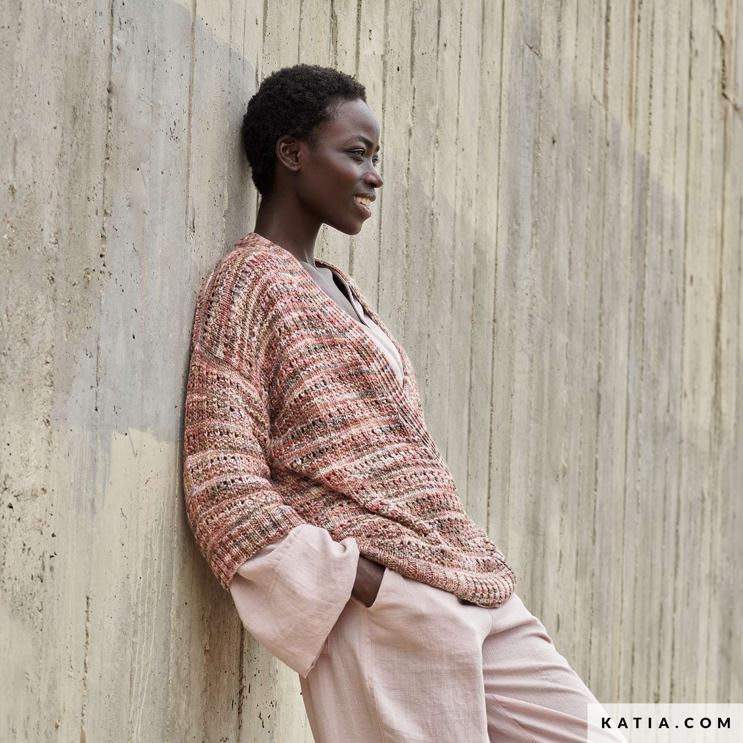 Stricke eine elegante Wickeljacke im zarten Lochmuster in glatt rechts. Die ¾-Ärmel und die seitlichen Knöpfe zum Schließen der Vorderseite sind besondere Highlights. Das Garn Bonsai mit seiner dezenten, mehrfarbigen Fantasie verleiht jedem Look einen lebendigen Touch. Warte nicht länger und setze die ersten Maschen für deine neue Lieblingsjacke