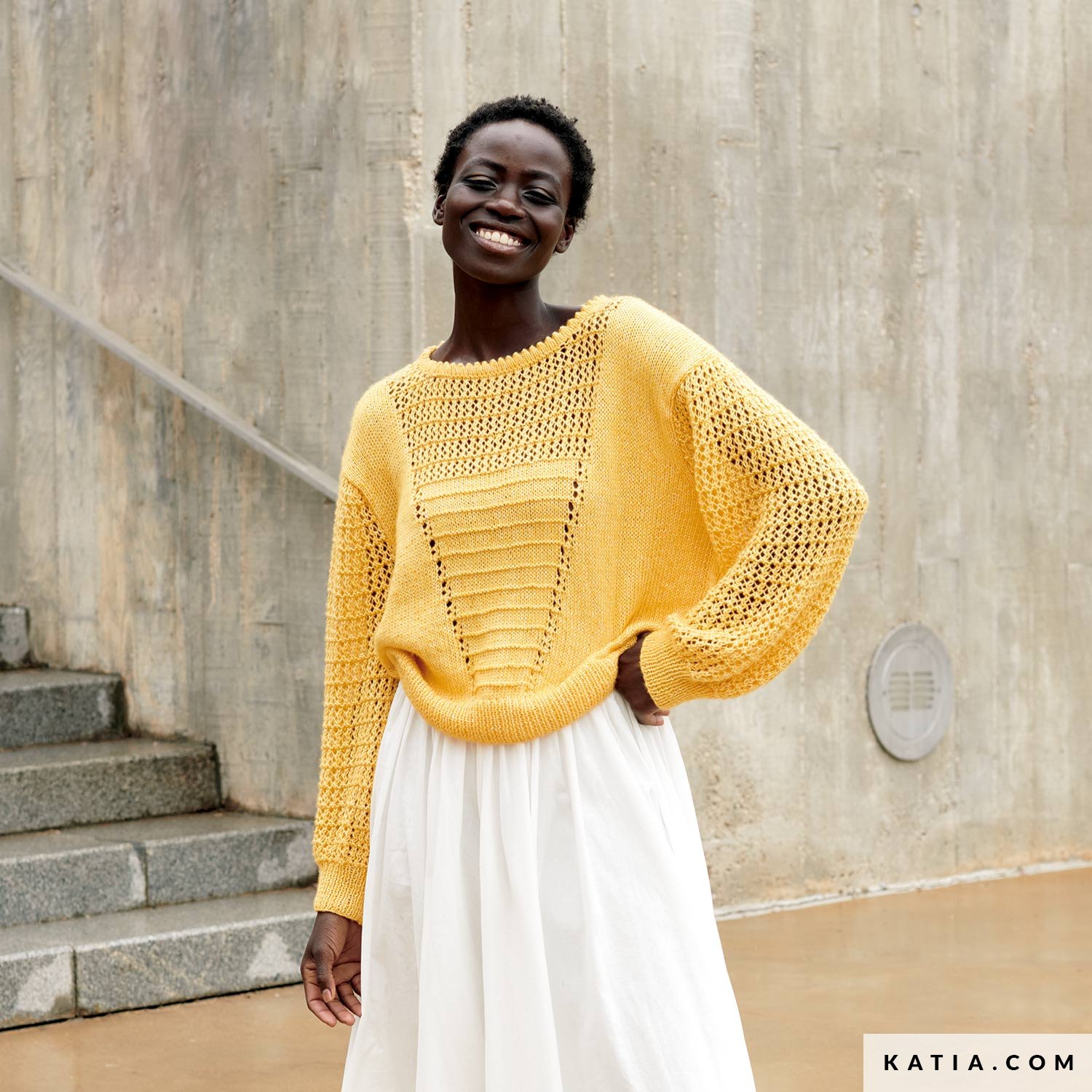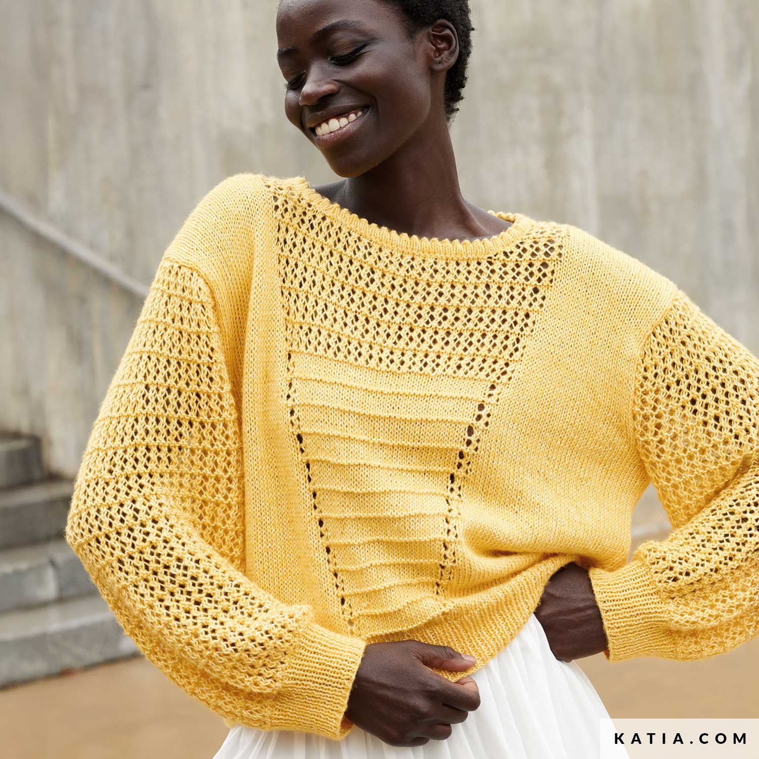 Stricke einen spektakulären Damenpullover aus Puro Cotone von Concept by Katia. Sein Design kombiniert ein wunderschönes Netzmuster mit originellen, von den 80ern inspirierten Details. Es ist das perfekte Kleidungsstück, um es mit luftigen Röcken zu kombinieren und deinen Looks eine einzigartige Note zu verleihen. Lass dich inspirieren und stricke dieses originelle und stilvolle Projekt!