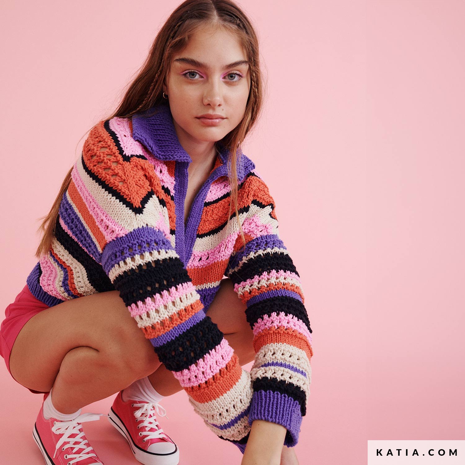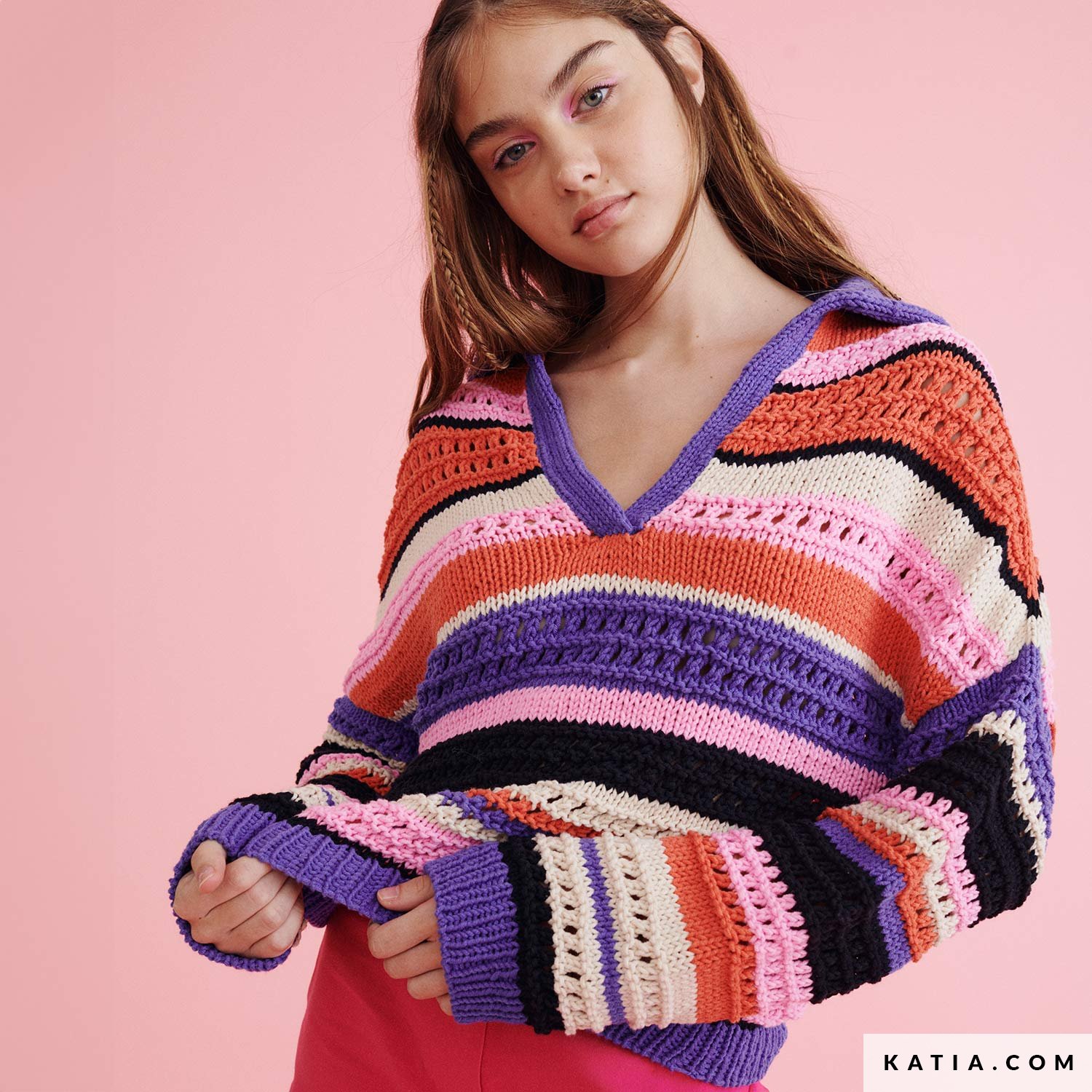 Entdecke die Anleitung für einen Sommer-Frühlings-Pullover mit Polo-Kragen Frida! Gestrickt in Summer Vibes von WOW! by Katia, ist er ein stilvolles und einzigartiges Kleidungsstück, das bunte Streifen zeigt und verschiedene Strickmuster kombiniert. Wähle deine 5 Lieblingsfarben des leicht zu strickenden Garns Summer Vibes von WOW! by Katia und mache dir dieses Design von @studioceliahoste zu eigen, um es mit deiner Lieblingsjeans zu tragen.