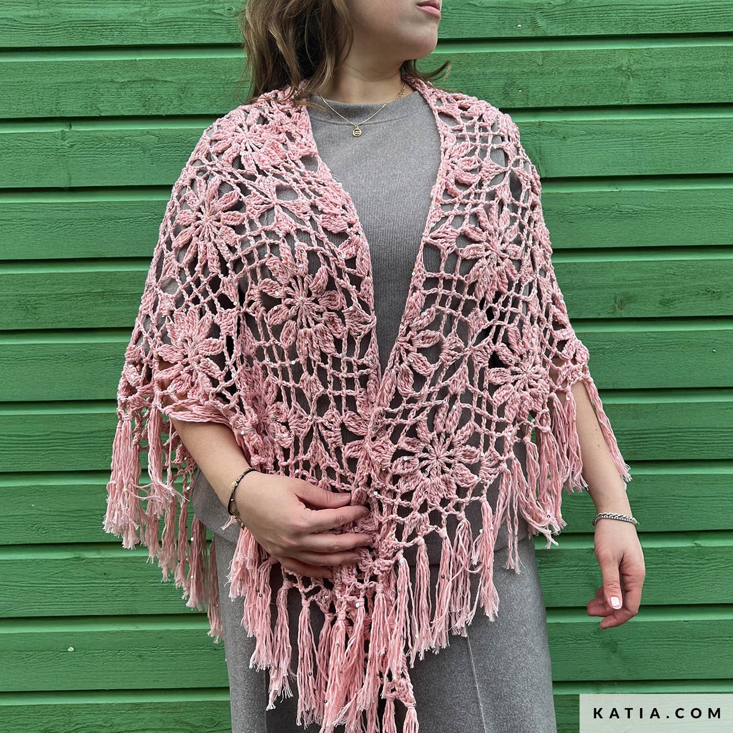 Ein dreieckiges Häkeltuch mit großen Blumenmotiven und langen Fransen, die für Bewegung und Eleganz sorgen. Das Cleopatra-Tuch, entworfen von Atty van Norel, wird mit Katia Cleopatra gehäkelt und besticht durch sein luftiges Muster und einen dezenten Glanz.