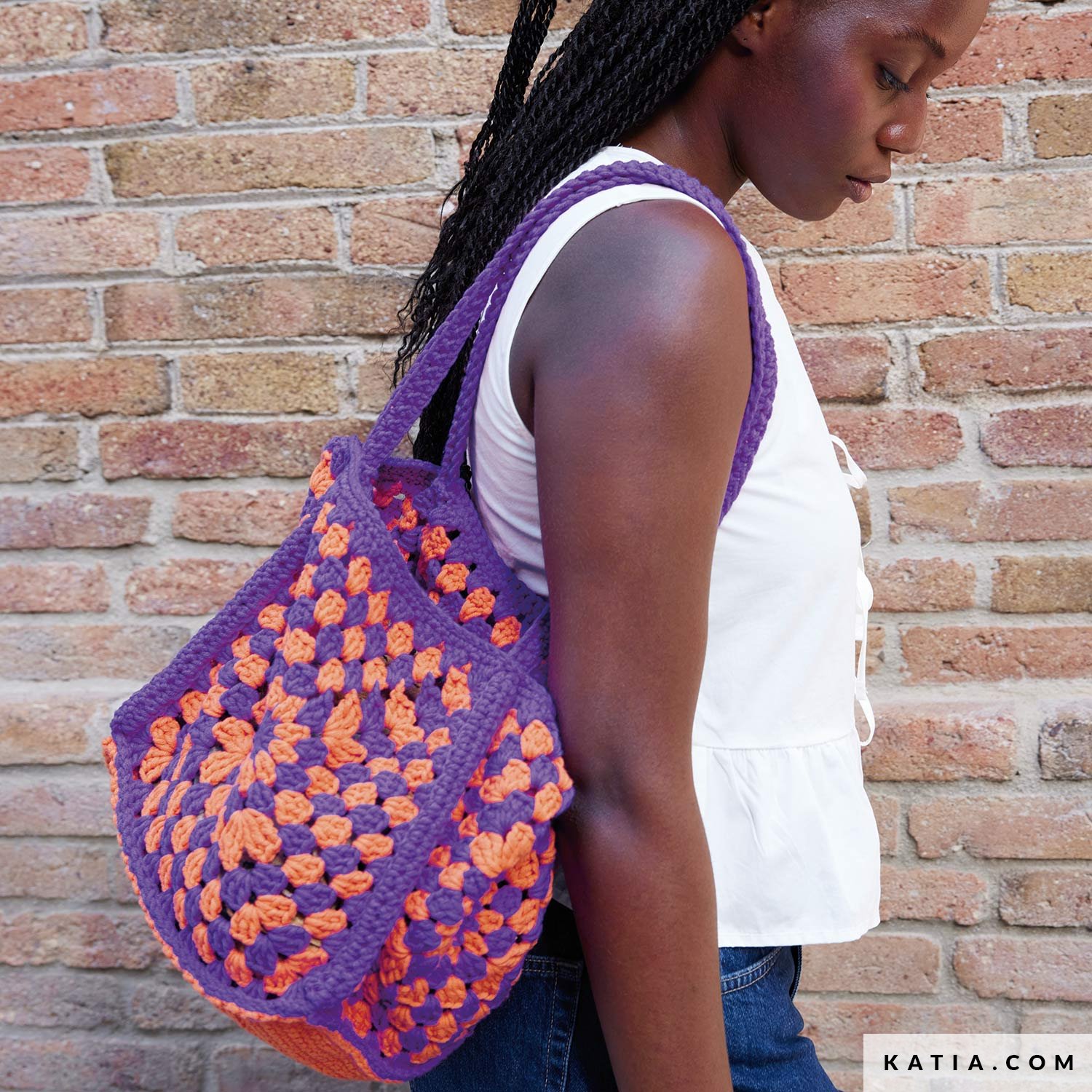 Große Häkeltasche aus Granny Squares mit Farbkontrast, ideal für einen fröhlichen, handwerklichen Look. WOW Summer Vibes bringt einen super bunten Sommer-Effekt und ein Finish mit Charakter für ein großes, praktisches Accessoire. Finde die Anleitung auf katia.com und in der Zeitschrift Bag to Basics. Kombiniere deine Lieblingsfarben und häkle deine Sommertasche.