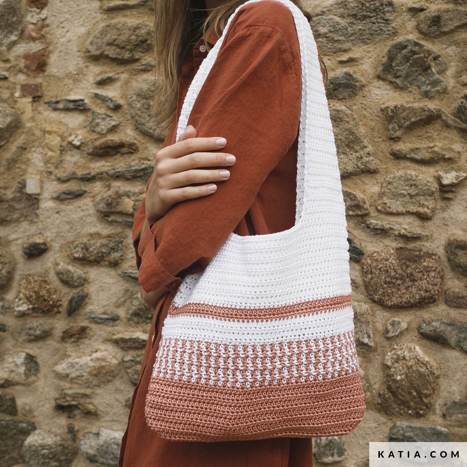 Tote Bag gehäkelt mit klaren Linien, perfekt zum Spielen mit Farbkombis. Katia Easy Crochet Capri sorgt für definierte Maschen und ein cleanes Alltags-Ergebnis. Finde die Anleitung auf katia.com und in der Zeitschrift Bag to Basics. Entspann dich beim Häkeln deiner Tote Bag und mach sie so kombinierbar, wie du willst.