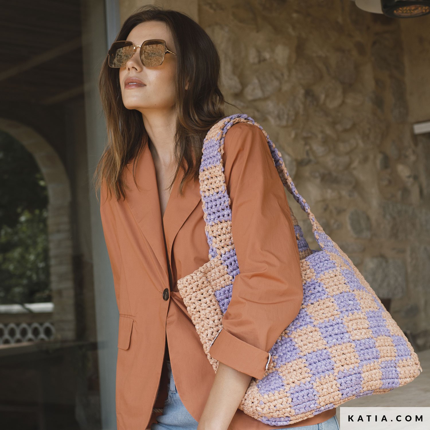 Shopper-Tasche gehäkelt mit zweifarbigem Karomuster und langem Henkel, perfekt für einen urbanen Look. Mit Katia Washi bekommst du eine bequeme Struktur und ein sauberes Finish, ideal für Jacquard beim Häkeln. Finde die Anleitung auf katia.com und in der Zeitschrift Bag to Basics. Machs in deinem Tempo und freu dich über deine neue Basic-Tasche mit handmade Touch.