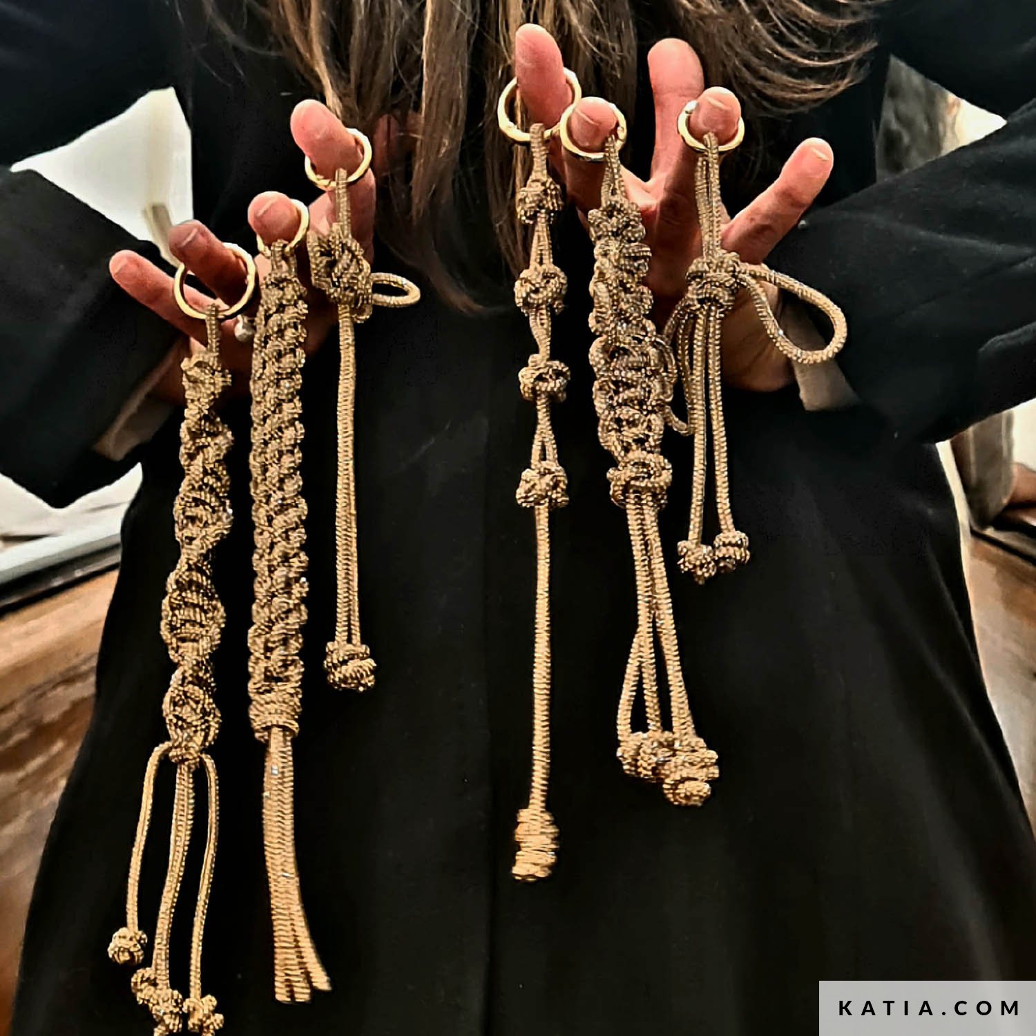 Verleihe deinen Taschen extra Glanz mit diesen 6 Makramé-Charms aus Katia Diamante. Mit einfachen Knoten machst du moderne, stabile und super glänzende Anhänger. Perfekt als Schlüsselanhänger, Taschendeko oder kleines Detail zum Personalisieren. Mit nur einer Spule kannst du mehrere Designs knoten und Formen, Längen und Abschlüsse kombinieren. Ein schnelles, leichtes Projekt, ideal für ein glamouröses Handmade-Finish.