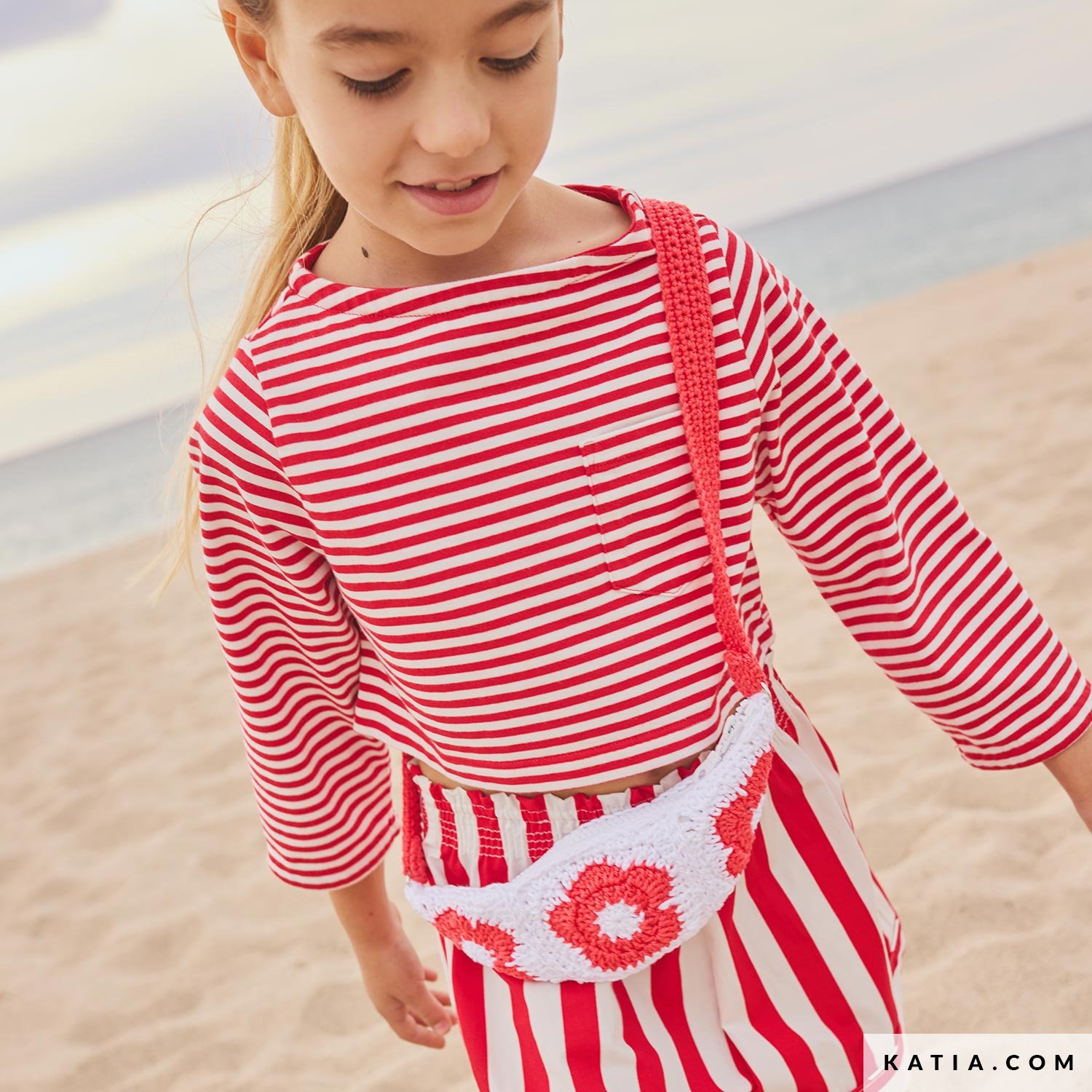 Häkle diese Kinder-Bauchtasche mit Katia Easy Crochet Capri, einer dicken Baumwolle – ideal für Einsteiger. Die Tasche besteht aus 4 Blumen-Granny-Squares in zwei Farben und einem gehäkelten Gurt zum Crossbody-Tragen. Verfügbar in der Zeitschrift Katia Kinder 117 und als PDF auf katia.com. Häkle ein praktisches, fröhliches Accessoire.