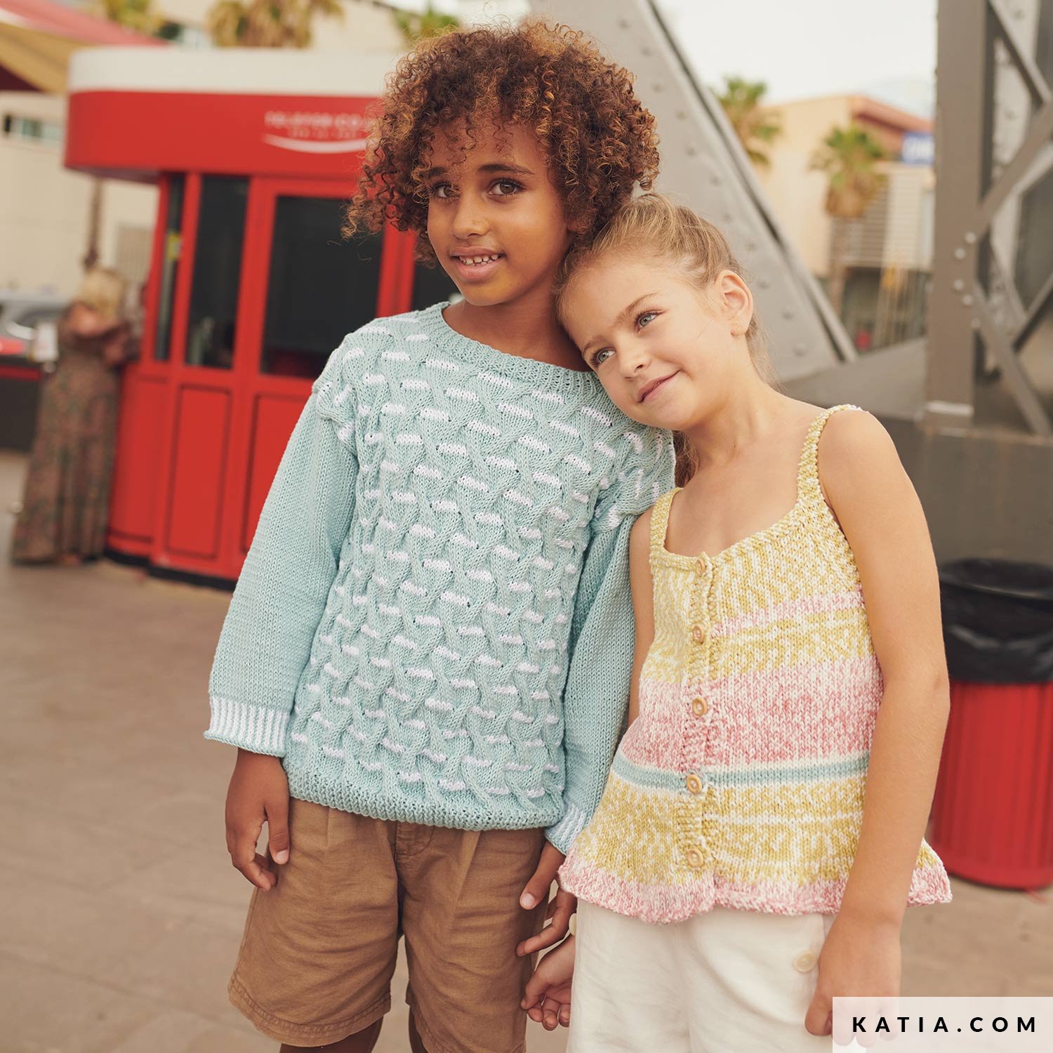 Dieser wunderschöne Kinderpulli mit Zopfmuster ist perfekt für kühlere Tage! Genieße mit Cotton 100% das Stricken des interessanten zweifarbigen Musters mit Streifen-Effekt und Zöpfen. Die Ärmelbündchen im Jacquardmuster mit blauen und weißen Längsstreifen heben sich von den einfarbigen Ärmeln in Glatt rechts ab. Die Anleitung ist für die Größen 4 bis 12 Jahre erhältlich.