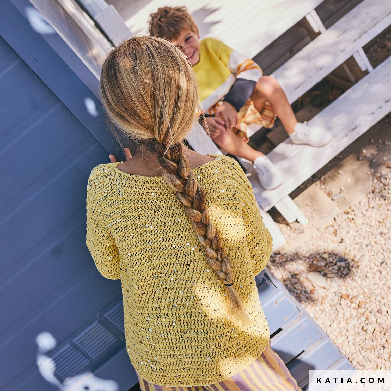 Diese einfache Anleitung für einen Mädchenpulli in einem unkomplizierten Fantasiemuster wird mit Katia Cleopatra gestrickt – weiche Baumwolle mit feinen Gold-/Silberpailletten. Die gerade Silhouette ist leicht und bequem, ideal mit einem Hauch Glanz. Verfügbar in der Zeitschrift Katia Kinder 117 und als PDF auf katia.com. Stricke ein modernes, fröhliches Teil.