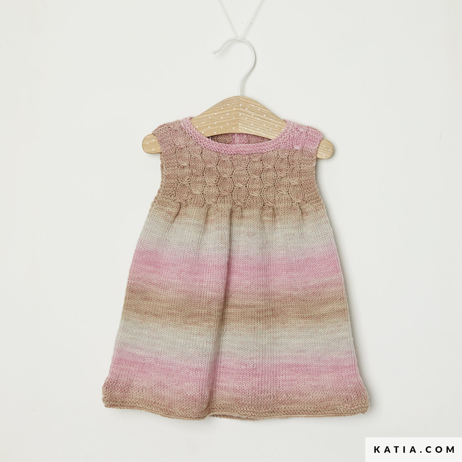 Dieses ärmellose Babykleid wird in der Runde gestrickt und zeigt so –ohne Unterbrechung– den wunderschönen Degradé-Effekt von Merino Baby Aquarelle. Besonders schön sind das Zopfmuster der Passe, die kleinen Falten und das Halsbündchen in Kraus rechts. Die Anleitung ist erhältlich für die Größen 3 bis 24 Monate.