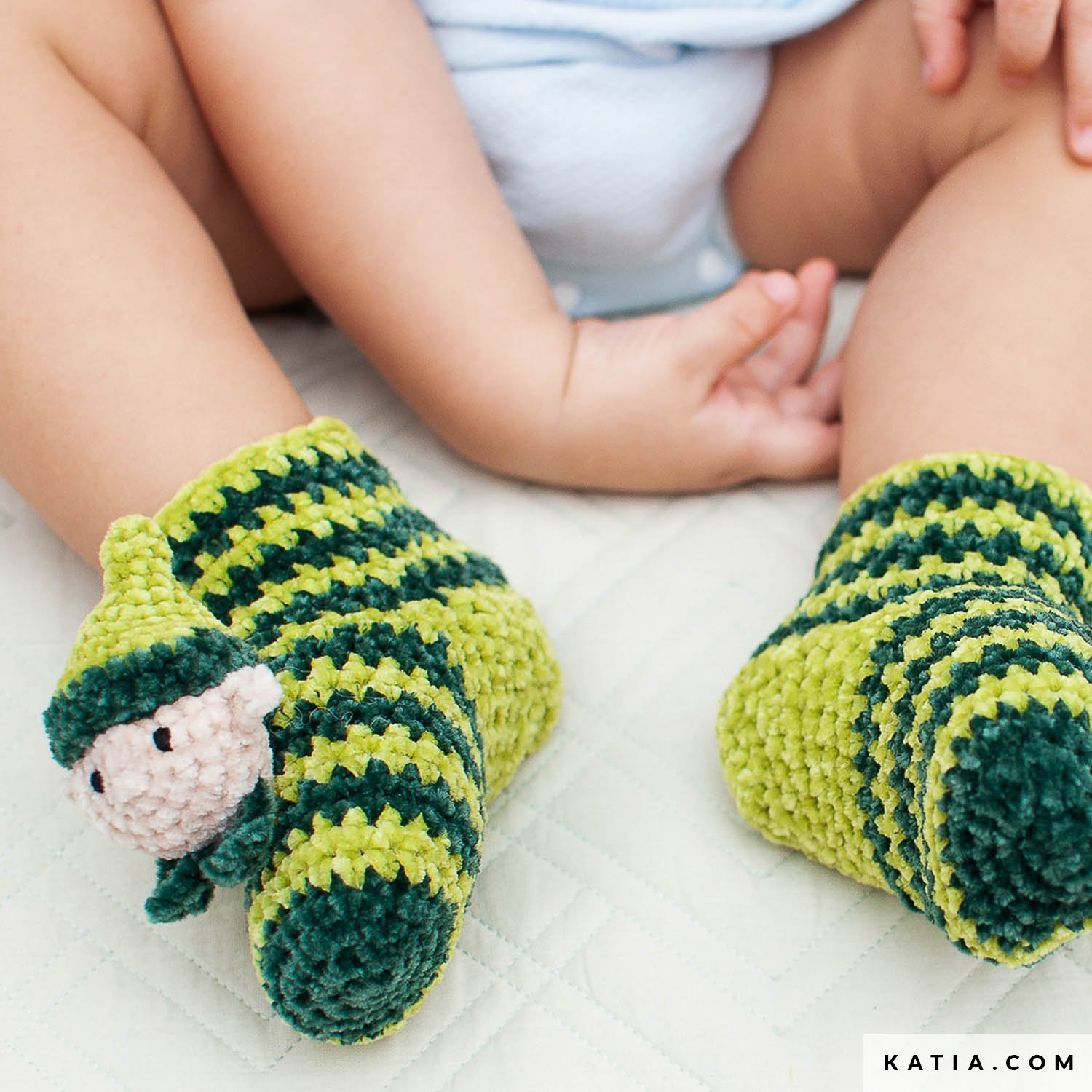 Gehäkelt mit Katia Sockirumi, einem Chenillegarn mit Plüscheffekt – perfekt, um die kleinen Füße warm und weich einzuhüllen.