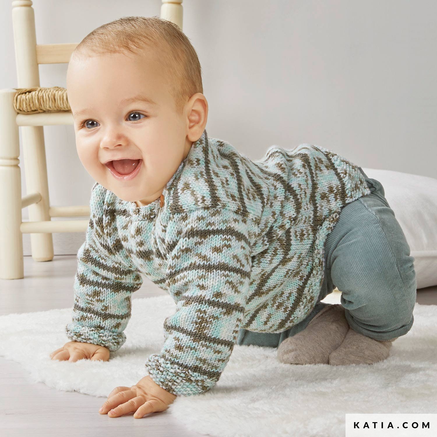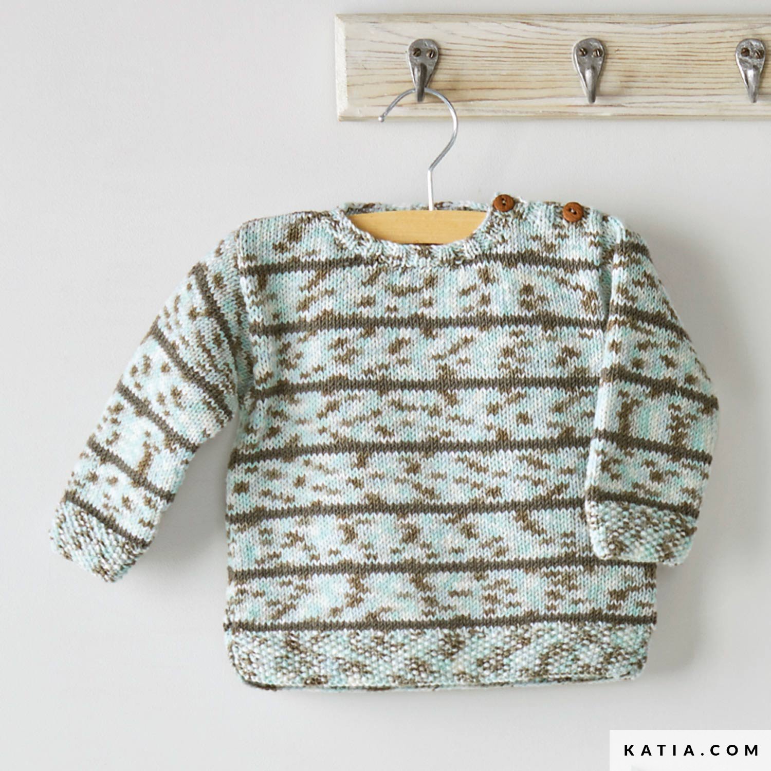 Einfacher Babypullover mit Knöpfen auf der Schulter. Stricke ganz einfach ein modernes Design dank der Kombination des Sprenkeleffekts von Merino Baby Plus mit feinen unifarbenen Streifen aus Merino Baby.