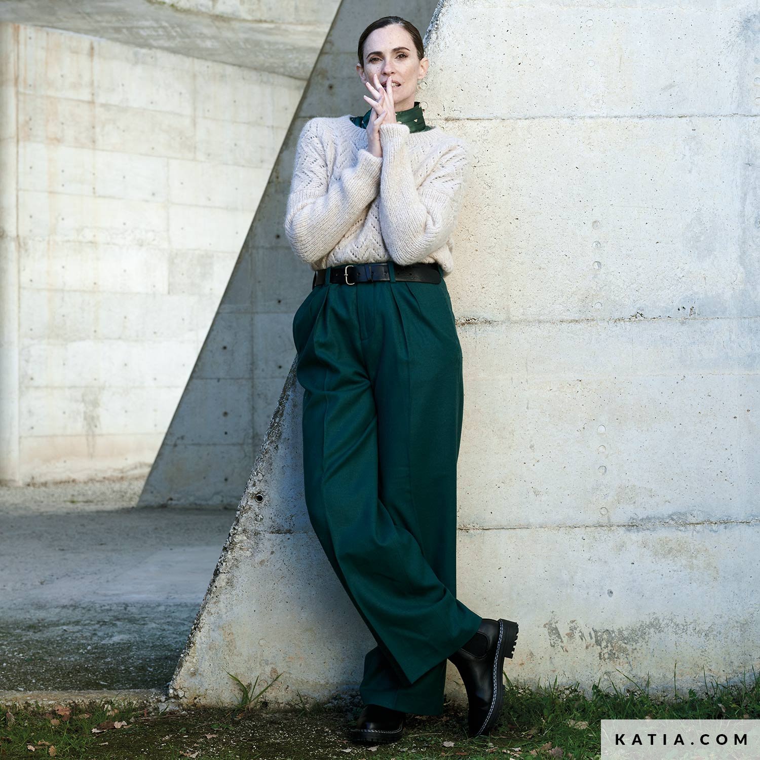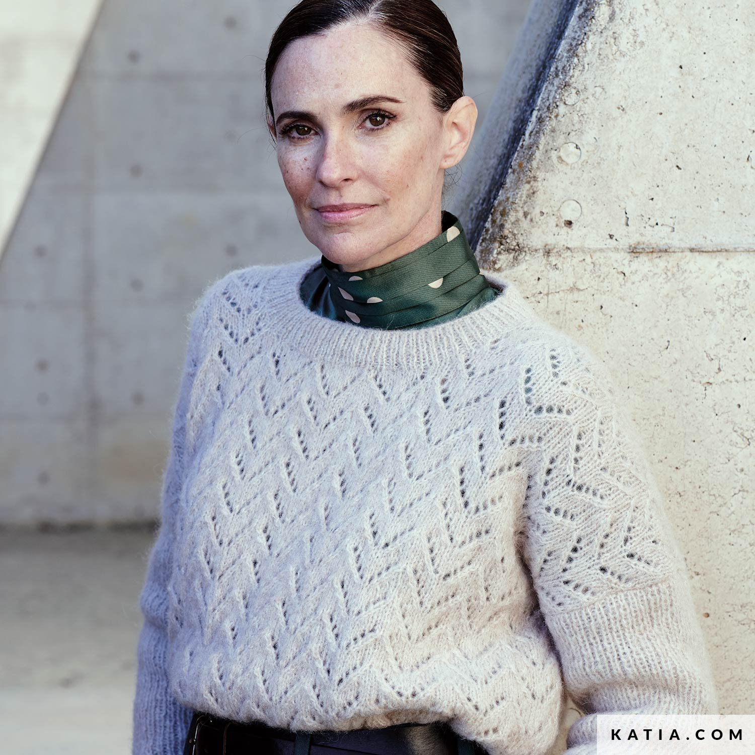 Kastiger Strickpullover aus Alpaca Silver mit geraden Ärmeln. Der Körper ist einem Lochmuster gestrickt, dass an Pfeile erinnert. Die Ärmel sind im Rippenmuster 1x1 gearbeitet. Er hat einen großen Rundhals-Ausschnitt, sodass die Blusenkragen gut zur Geltung kommen. Die Anleitung mit dem großen Kragen, den Arm-Bündchen und dem Bund gibt dem Modell einen eleganten Touch.