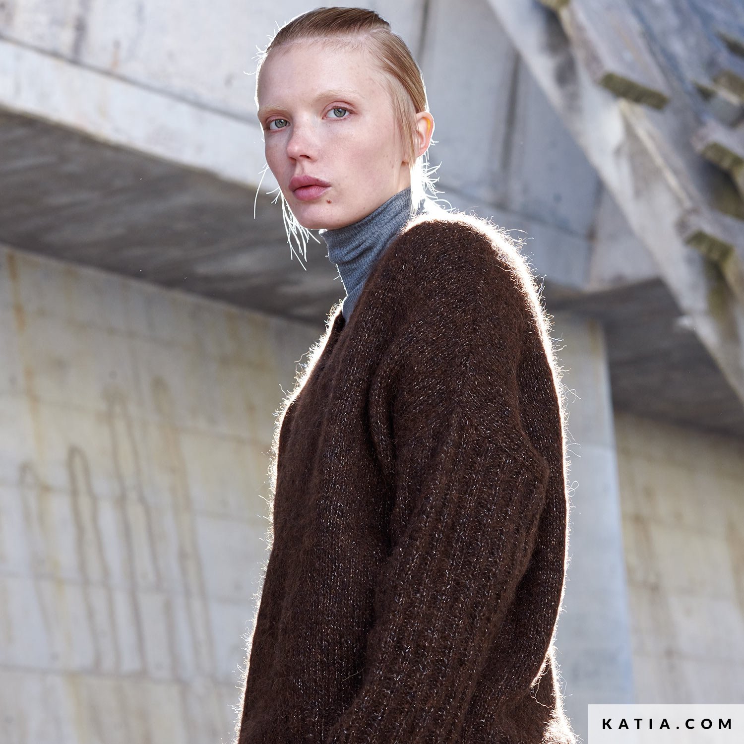 Dieser Damenpullover ist aus der Wolle Alpaca Silver in einem schönen Dunkelbraun mit einem dezenten Glanz gestrickt. Er hat einen V-Ausschnitt mit Smokingkragen. Es ist wahrlich ein elegantes, leichtes und doch sehr wärmendes Strickstück.