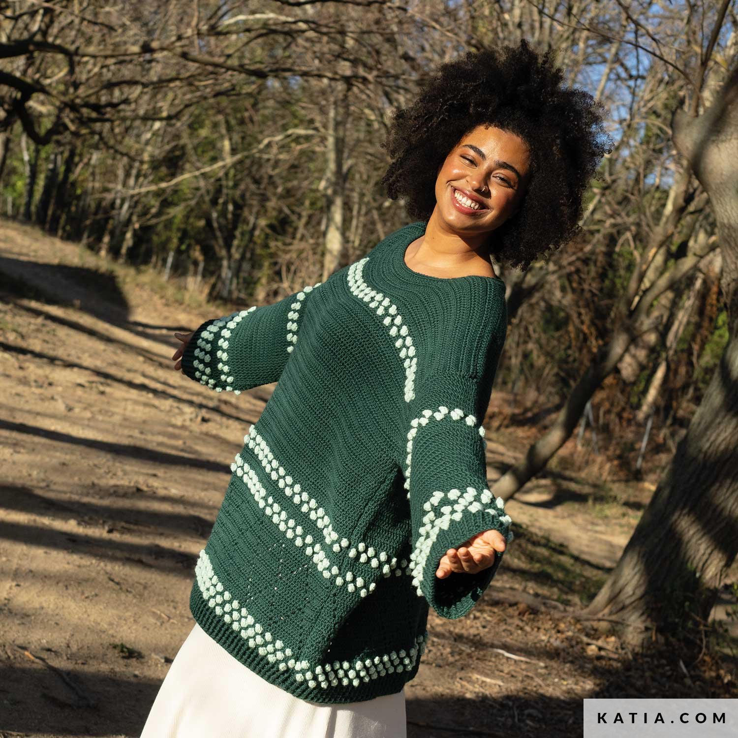 Wenn du ein originelles Häkelmodell suchst, ist die Anleitung für einen Häkelpullover aus Katia Basic Merino, einem idealen Mischgarn für deine Alltagskleidung, perfekt für dich. Dieser Maxi-Pullover kombiniert Jacquardmuster für die Noppen, Rautenmuster im unteren Bereich und elastische Maschen an Bündchen und Saum. Er wird in zwei Farben gehäkelt, die deiner Kleidung Kontrast und Leuchtkraft verleihen. Wähle deine Farben und beginne noch heute mit dem Häkeln!