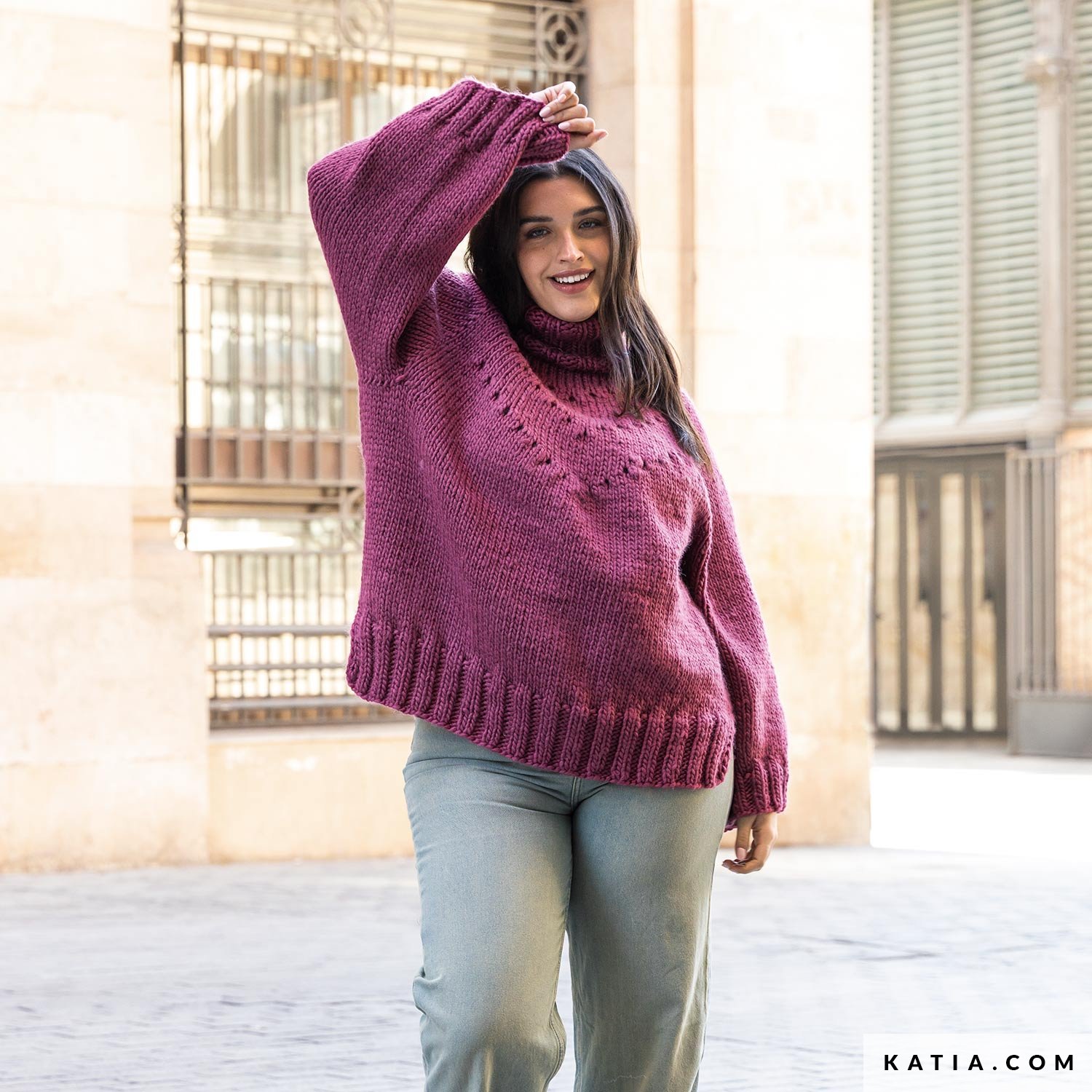 Stricke einen bequemen Top-Down-Pullover in Runden mit der Anleitung aus der Zeitschrift Katia Sport 119. Mit einem großen Rollkragen und einem eleganten Lochmuster in "V"-Form ist dieses Design perfekt, um es mit all deinen Hosen zu kombinieren. Die dicke Wolle Katia Mindwoolness macht diesen Pullover zu einem sportlichen Kleidungsstück, das auch als Jacke dienen kann. Verleihe deinen Looks mit diesem Pullover Stil und Komfort!