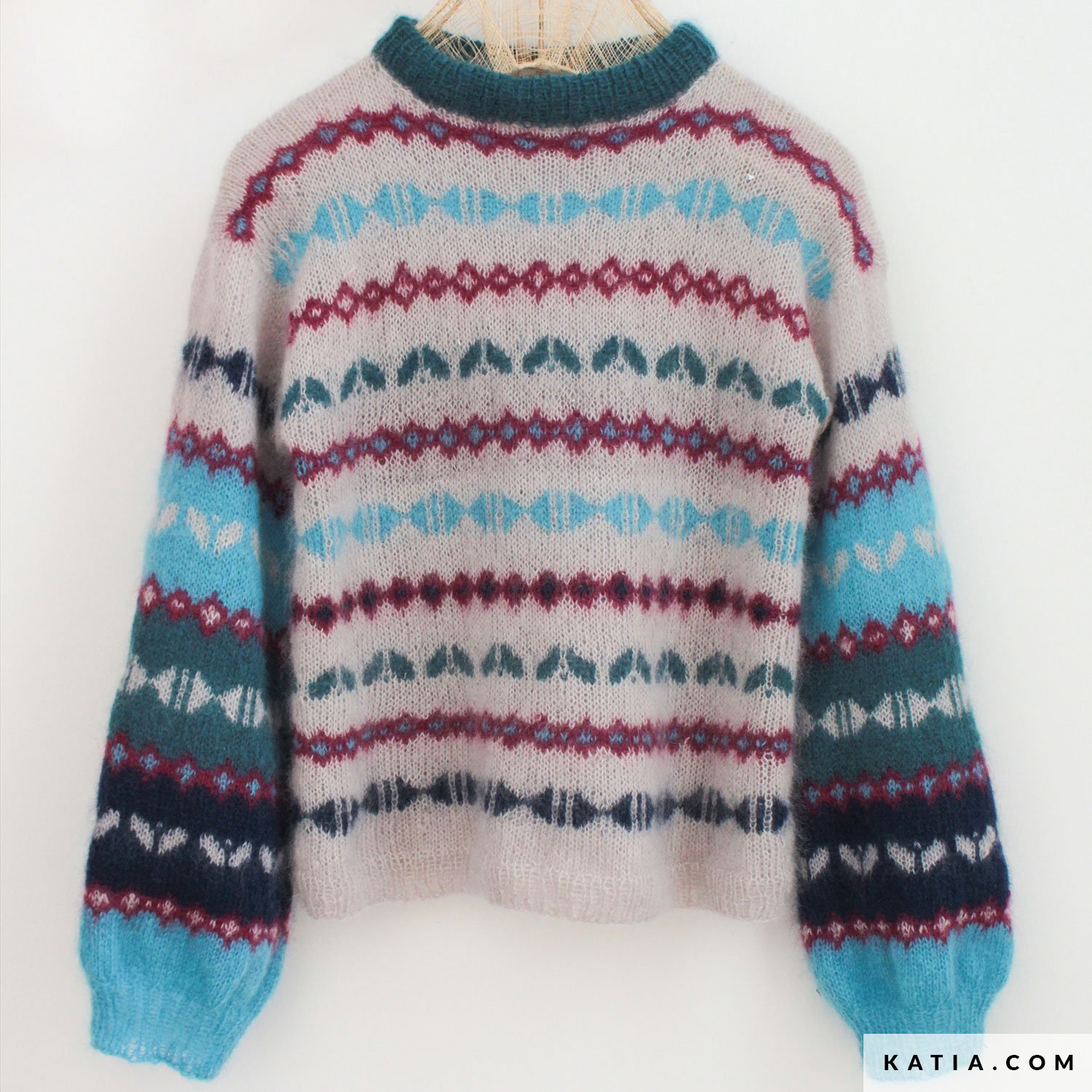 Sind Pullover im Nordic style die absoluten must-knits der Saison. Spiel mit unendlichen Farbkombinationen für Borten, Passen und geometrische Motive. Wir schlagen diesen Pullover aus 50 Mohair Shades vor, in Jacquardmuster hervorsticht. Dieser Pullover wird von unten nach oben in Runden bis zum Armausschnitt gearbeitet. Am Armausschnitt werden die Maschen in 2 gleiche Teile (Vorderteil und Rückenteil) aufgeteilt und es wird in Hin- und Rück-Reihen weitergearbeitet.