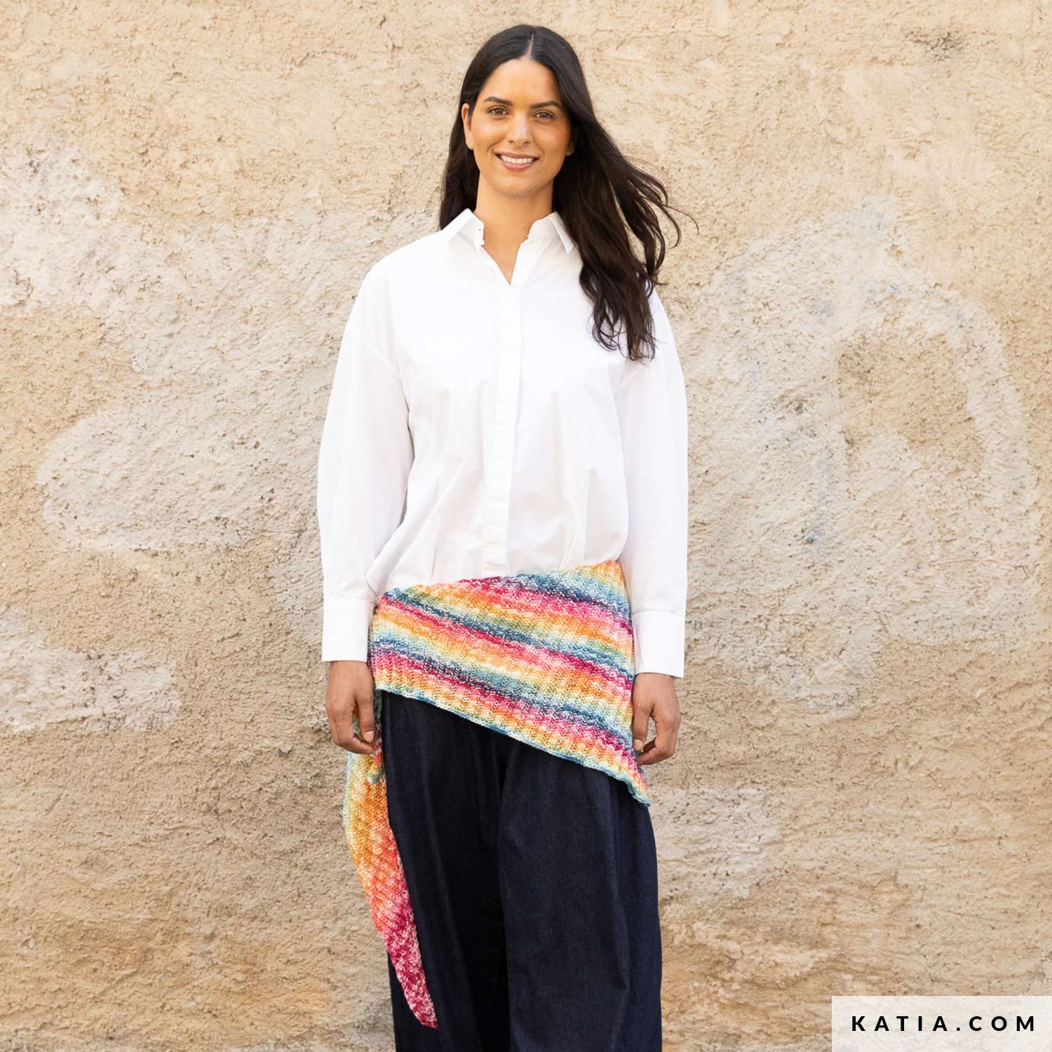 Lerne Schritt für Schritt, wie du dieses einfache und farbenfrohe Tuch strickst – entworfen von Sylvie Rasch mit dem Garn CraSy® Symmetric Socks & More von Concept by Katia.