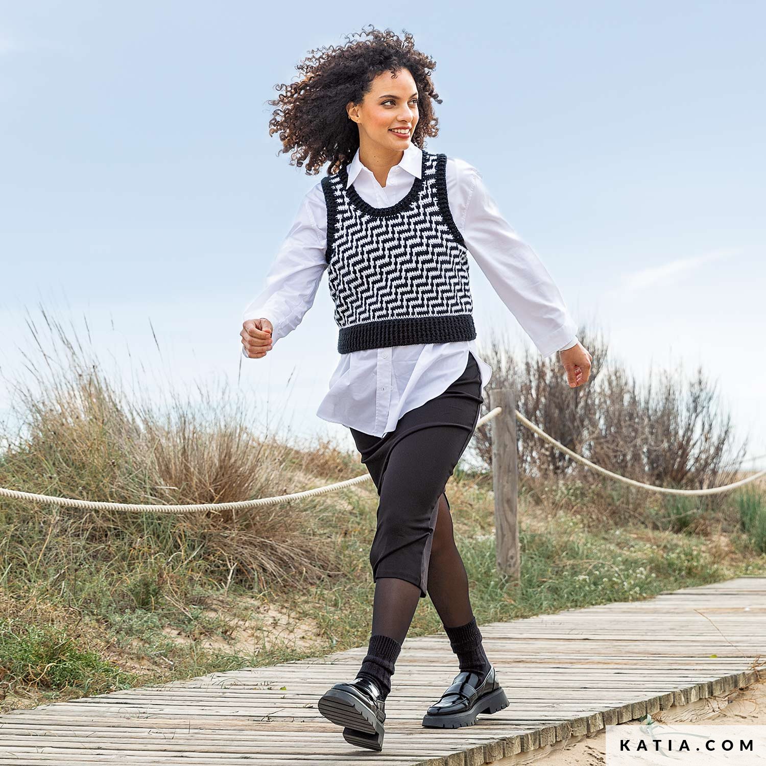 Mit dieser Anleitung häkelst du einen zweifarbigen Pullunder mit geometrischem Muster in Schwarz-Weiß. Arbeite mit Katia Basic Merino das wunderschöne Apache-Muster sowie gehäkeltes Rippenmuster. Das moderne Stück ist inspiriert von der Netflix-Serie "Wednesday" und perfekt zum Kombinieren mit deinem All-Black-Look oder deiner weißen Lieblingsbluse.