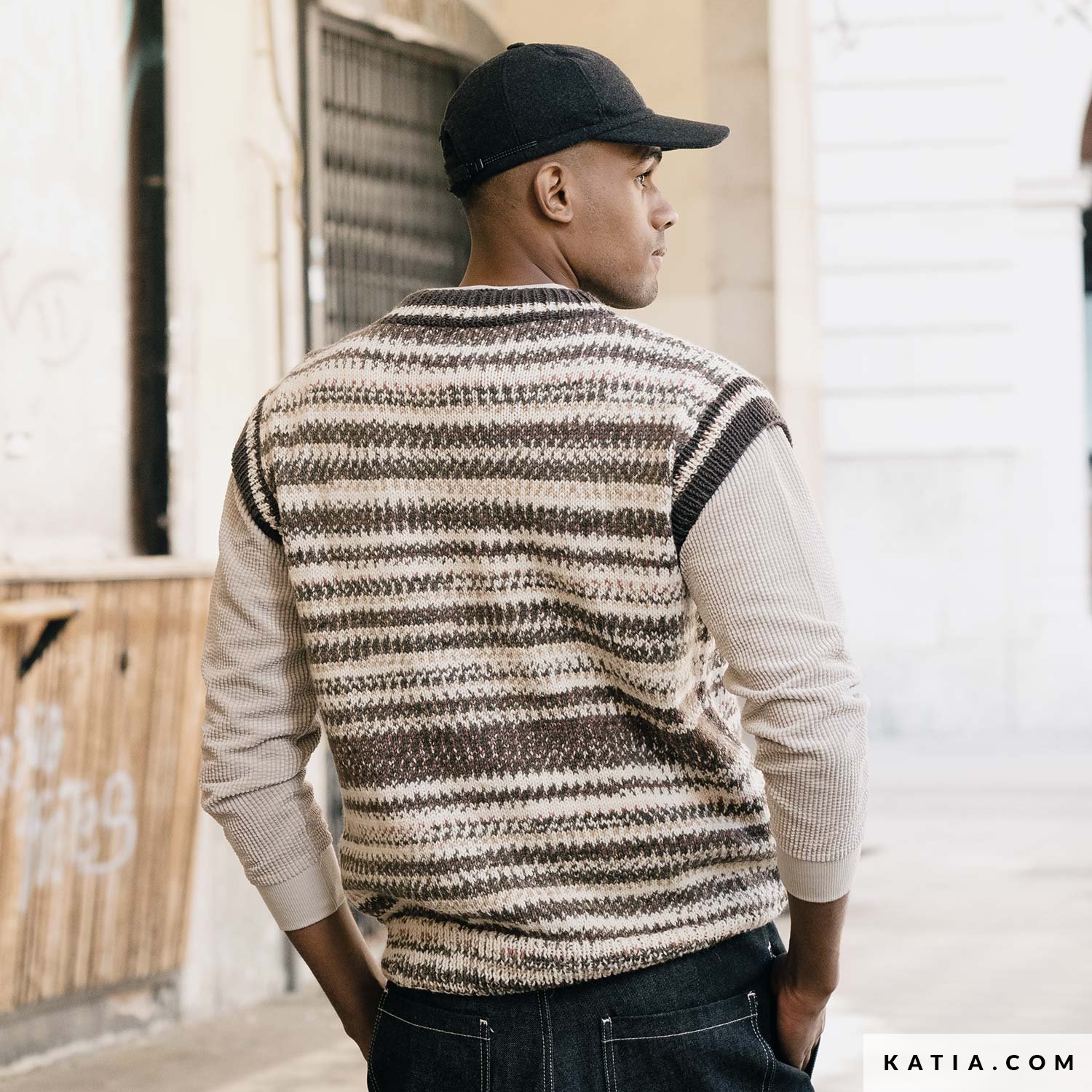 Dieser Herren Pullunder ist aus Merino 100 % und Scandinavia, einem Garn, welches in einem Jacquardmuster gefärbt ist, gestrickt. Die Anleitung hilft ein aktuelles Kleidungsstück zu erschaffen. Der Pullunder lässt sich sowohl zu sportlichen Shirts wie auch zu Business-Hemden tragen.