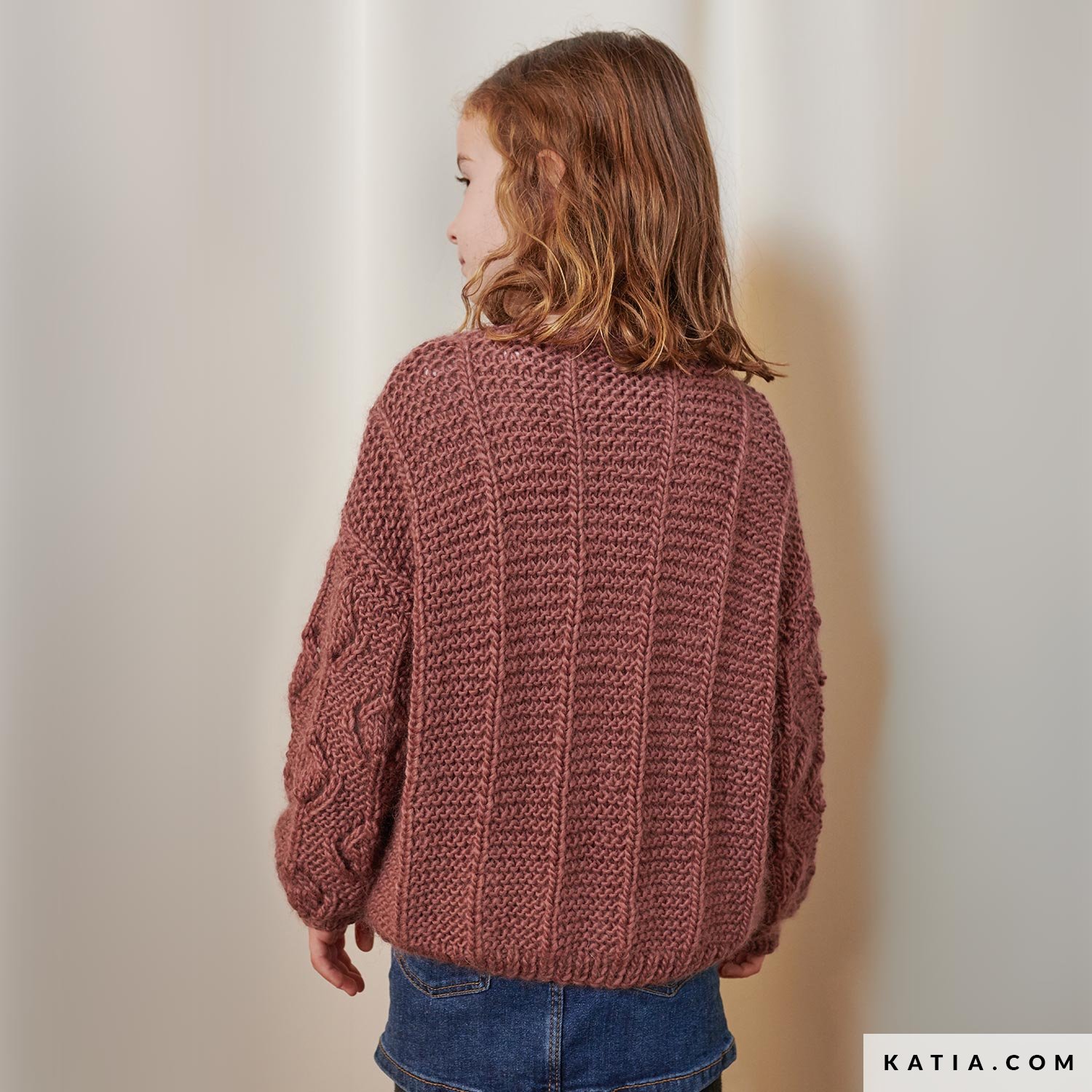 Schöne weite Strickjacke für Mädchen mit V-Ausschnitt, gestrickt mit Supreme Merino in einer Herbstfarbe. Design mit Lochmuster an den Ärmeln und vertikalen Linien am Rumpf. Ein Modell für jede Gelegenheit, mit Anleitungen für die Größen von 4 bis 12 Jahren.