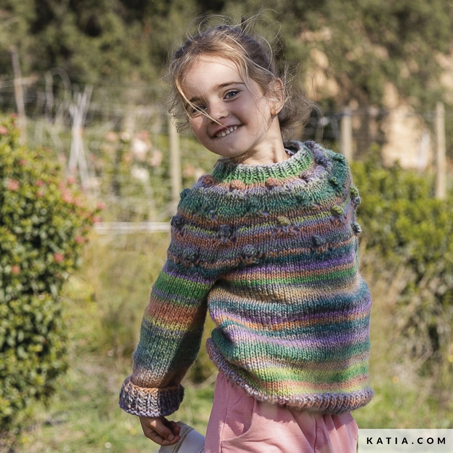 In der Runde gestrickter Pullover für Mädchen mit fröhlichen Noppen an der Passe. Anleitung für die Größen 2 Jahre bis 10 Jahre.