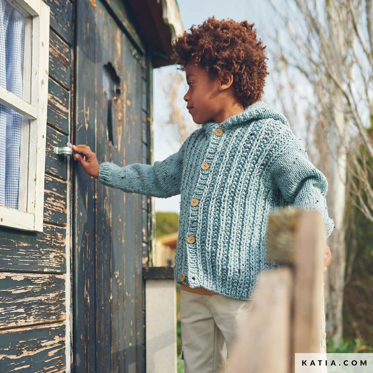 Stricke eine supermoderne Kapuzenjacke für die Kleinen! Mit dieser Anleitung für die Größen 4 bis 12 Jahre. Das Design hat vertikale Linien im Strukturmuster, Ärmel und Kapuze in Glatt rechts und Bündchen im Rippenmuster 1x1. Stricke sie aus Katia Bulky Tweed für einen modernen Tweed-Look. Ein trendiges Stück für deine Kids!