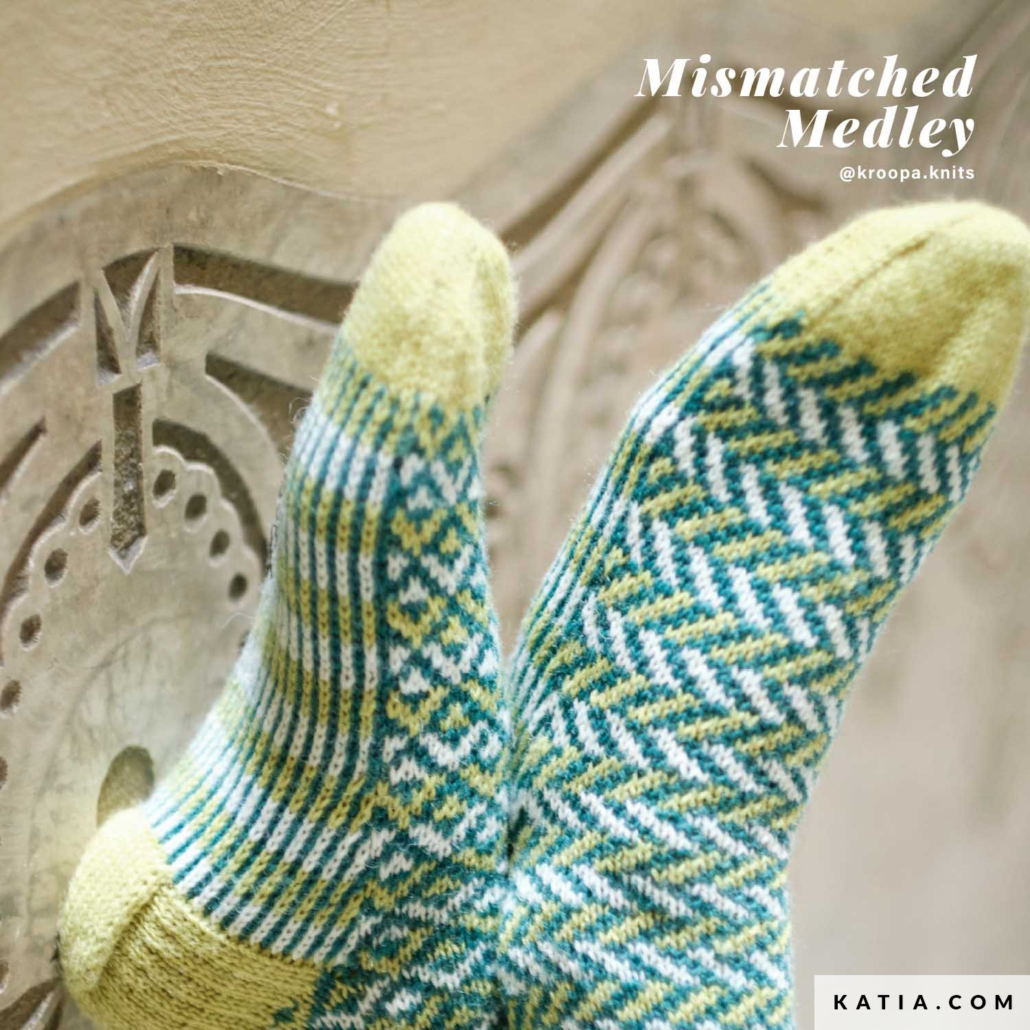 Mismatched Medley ist ein modernes und fröhliches Colorwork-Design von Karolina Adamczyk, bei dem die Socken des Paares nicht gleich sind: „Sie sind entworfen, um einzigartig zu sein, mit einem geometrischen Muster, das bei beiden Socken unterschiedlich ist.“