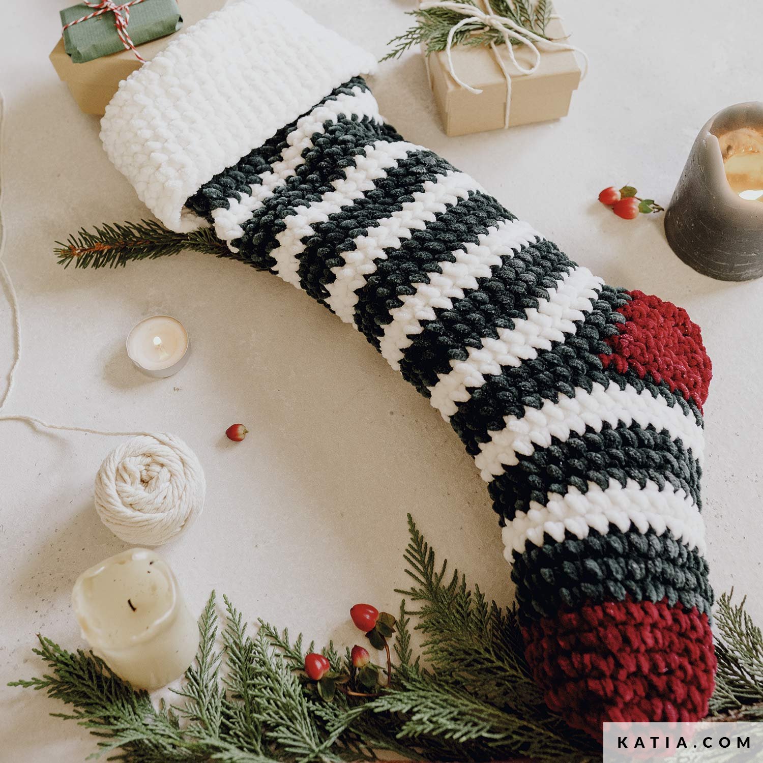 Wenn du nach Weihnachtsdekorationsideen suchst, schlagen wir dir vor, einen Weihnachts-Stiefel in 100 % weihnachtlichen Farben zu häkeln. Du brauchst nur 3 Knäuel Katia Christmas Bambi, um dieses Weihnachten dein Zuhause zu dekorieren. Viel Spaß beim Häkeln von Weihnachtsstrümpfen für die ganze Familie und Freunde!