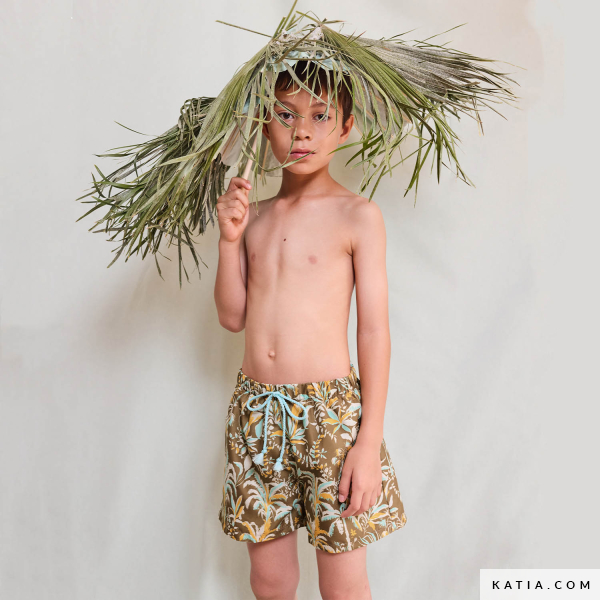 Sew swimming trunks with this sewing pattern by Katia Fabrics, ideal for the pool and the beach. The design includes an elastic waistband with drawstring and a back pocket, ensuring a comfortable and practical fit. Recommended for sewing swimming trunks with Katia Fabrics’ quick-dry swim fabric, available in original and fun prints in summery colors. An easy and useful sewing project for your little one’s summer wardrobe.