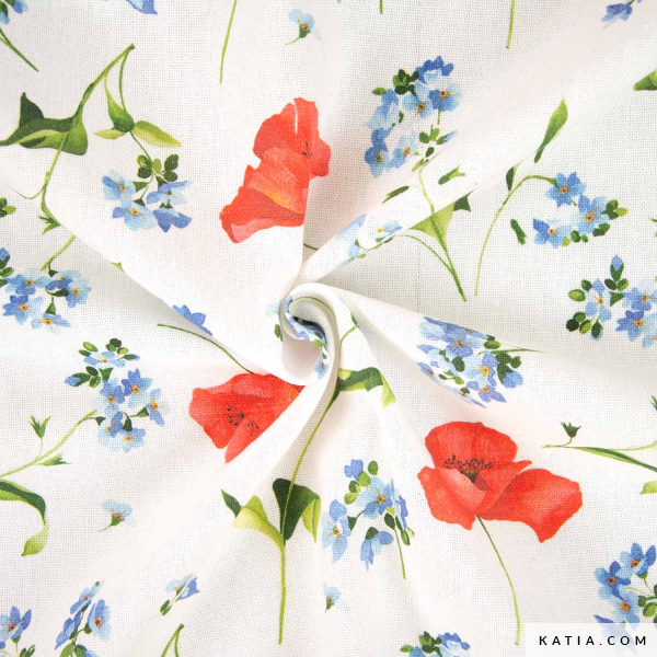 Fill your projects with color and freshness with the Cotopaxi Poppy recycled canvas by Katia Fabrics, a sturdy fabric featuring a floral print of red poppies and small blue flowers on a white background. A cheerful and natural design that conveys both energy and softness. Thanks to its medium weight and firm structure, this canvas is perfect for sewing handbags, toiletry bags, backpacks, cushions, or creative decor projects. Plus, being made from recycled materials, it is an environmentally friendly option.