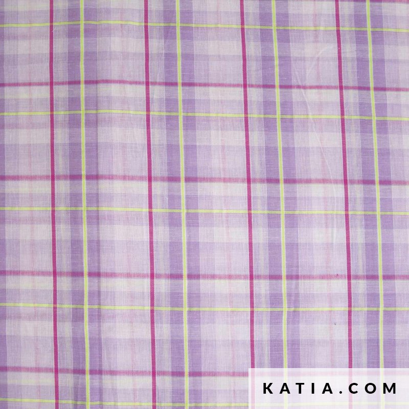 This fabric for checked shirts is available in neon yellow and lilac colors. This Neon & Lilac Fluor Madras checked fabric by Katia Fabrics is a thin, lightweight fabric weighing 95 g/m², perfect for sewing garments like shirts and dresses. In the Katia Fabrics sewing pattern magazines you’ll find the perfect patterns to sew T-shirts or dresses that fit this checked fabric to a tee.