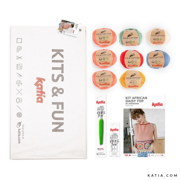 Every season, fashion falls head over heels for the charm of granny squares. At Katia, we suggest making this summer must-have with your own two hands: a flower crochet top, with wavy borders and plenty of color. Inside the African Daisy Kit by @ameskeria you’ll find balls of Fair Cotton in 6 different colors, a crochet hook, and a tapestry needle. Follow the printed pattern and the video available with your purchase of the kit to make this colorful single size crochet summer top.