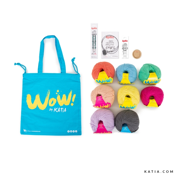 The kit includes balls of Summer Vibes from WOW! by Katia in your favorite color combination and, a 100% cotton tote bag.