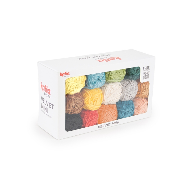 Fill your world with color and softness with the Katia Velvet Mini set! Bring the most adorable velvety amigurumis to life with 14 balls of chenille yarn in vibrant colors. Each 50-gram ball provides exceptional softness and durability, perfect for making crochet plush toys that remain soft and whose fluff doesn’t rub off over time. With the QR code included in the box, get direct access to a free pattern with video tutorial for the Fruitanimals by Gallimelmas. With this same set, you can also make the Coffee&Cakes pattern designed by Bommelie, included in the Amigurumi ❤️ Chenille e-book. Add a plush touch to your creations with Katia Velvet Mini!