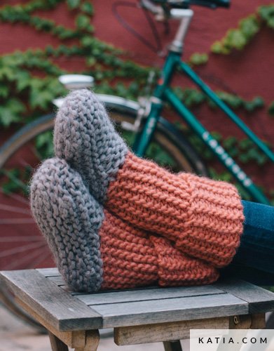 Stricke warme Hausschuhe aus 3 Knäueln Katia Love Wool in zwei Farben. Das Projekt wird flach in Kraus rechts gestrickt und anschließend seitlich zusammengenäht. Sohle und Oberteil entstehen in einer Farbe, der Schaft in der zweiten für einen schönen Kontrast. Ein schnelles, einfaches Projekt zum Genießen des weichen Love-Wool-Komforts.