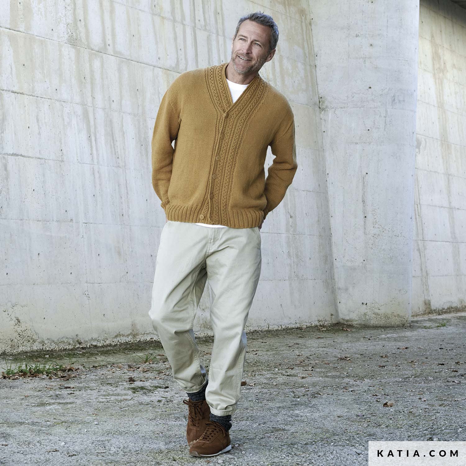 This men’s button-up jacket knit with Cotton in Love is a classic and timeless piece. Its straight lines and textured button bands give it an elegant touch, while the mustard color gives it a modern look. This cardigan is perfect to wear both day-to-day and on special occasions.