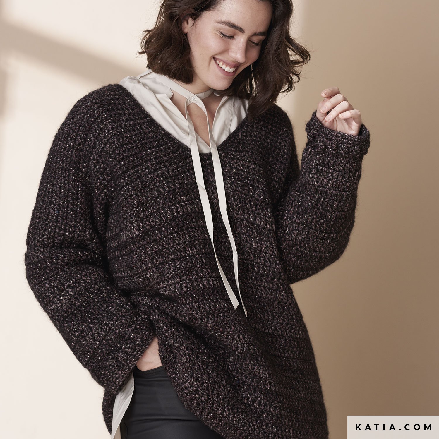 With this crochet pattern, enjoy the comfort of an oversized pullover, available in plus sizes, including little details like the popcorn stitches along the sleeve cuffs, which give it a different vibe. With Edén yarn, discover the importance of color and fiber choice used in a design.